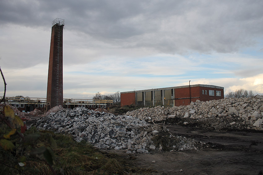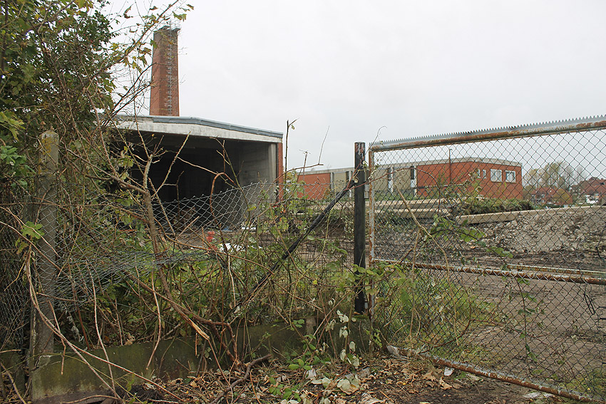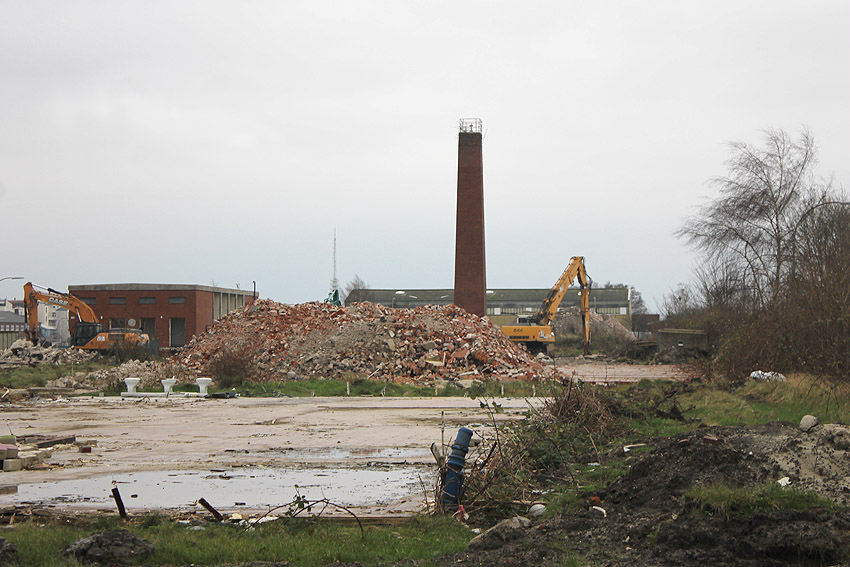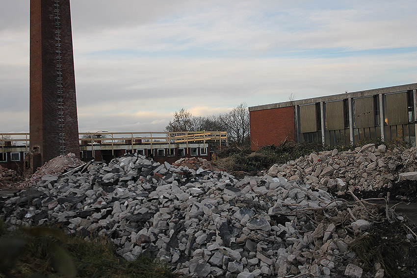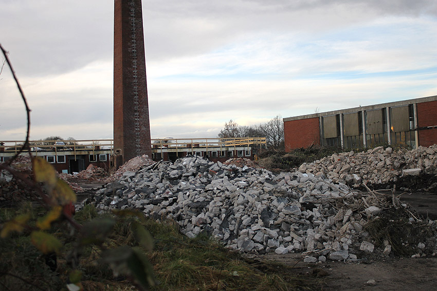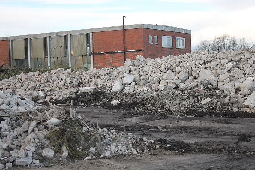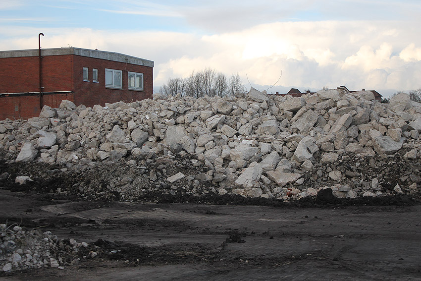 Das am Tiefbunker anliegende Heizwerk-Gebäude wurde bis auf den Schornstein abgerissen. Die Gebäudetrümmer lagern nun zunächst auf der Bunkerdecke.