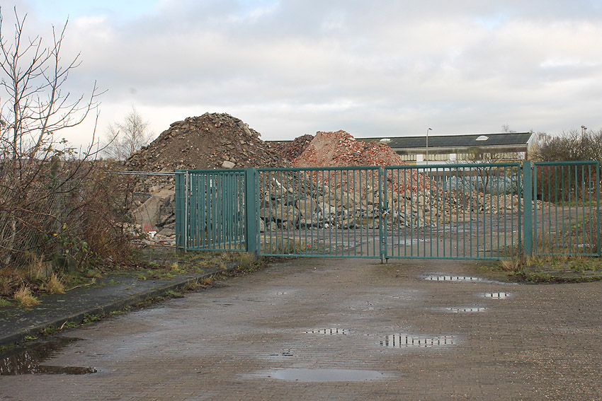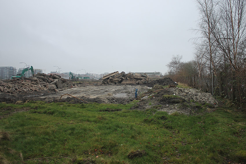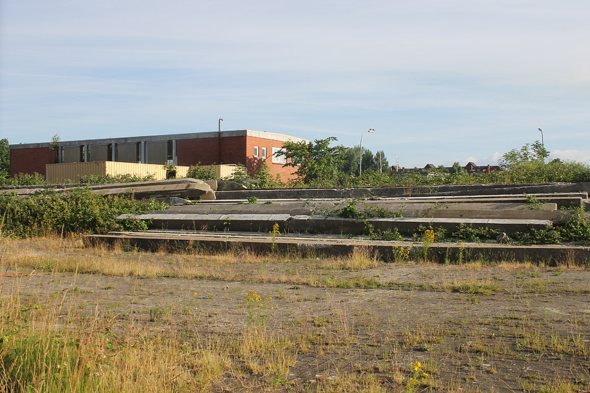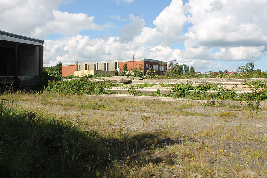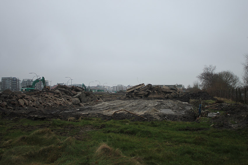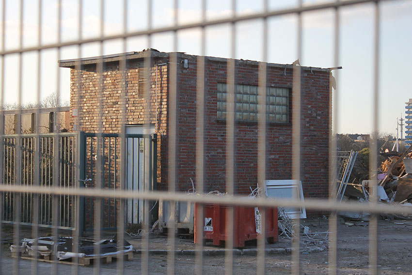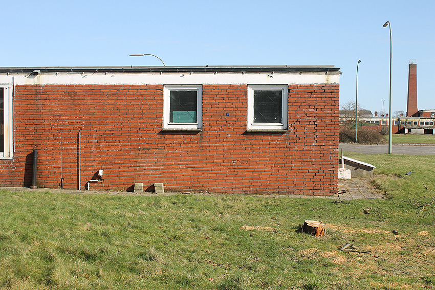 Das am Tiefbunker anliegende Heizwerk-Gebäude wurde bis auf den Schornstein abgerissen. Die Gebäudetrümmer lagern nun zunächst auf der Bunkerdecke.