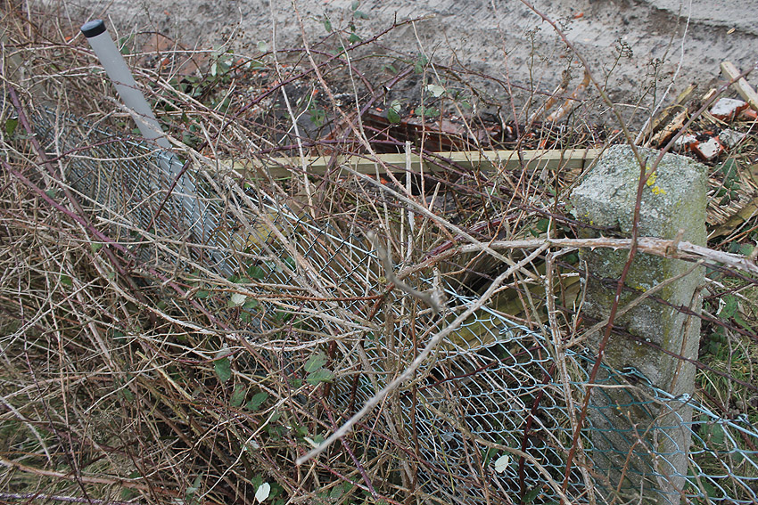 Einige Meter südlich des Objektes am Geländezaun befindet sich diese unter Wasser stehende Öffnung, die mit einer Stahlklappe (im Bild ganz unten zu sehen) versiegelt war. Besteht hier eventuell ein Zusammenhang?