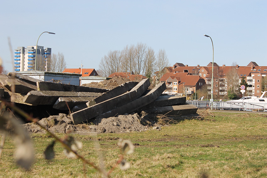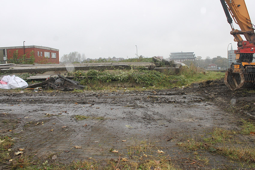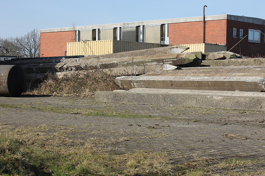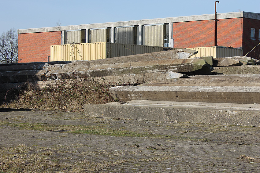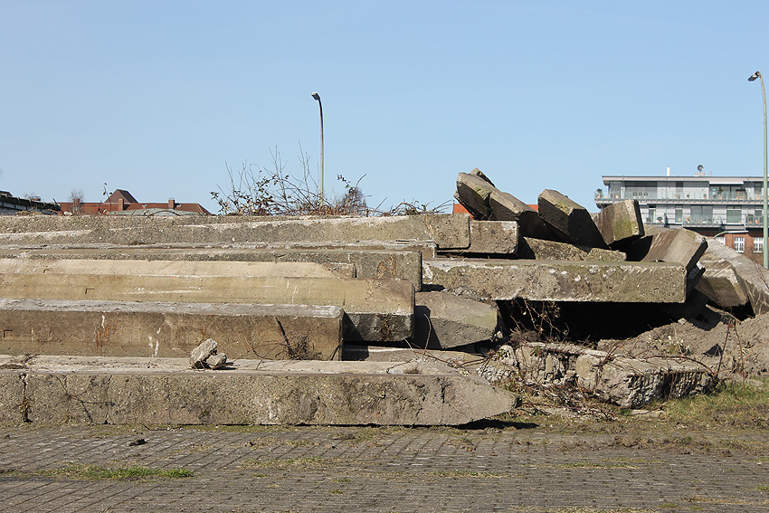 Es tut sich was. Die Stahlbetonfertigträger auf der Bunkerdecke wurden durch einen Bagger verschoben. Der Abrissbeginn dürfte näher rücken.