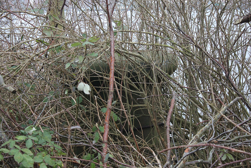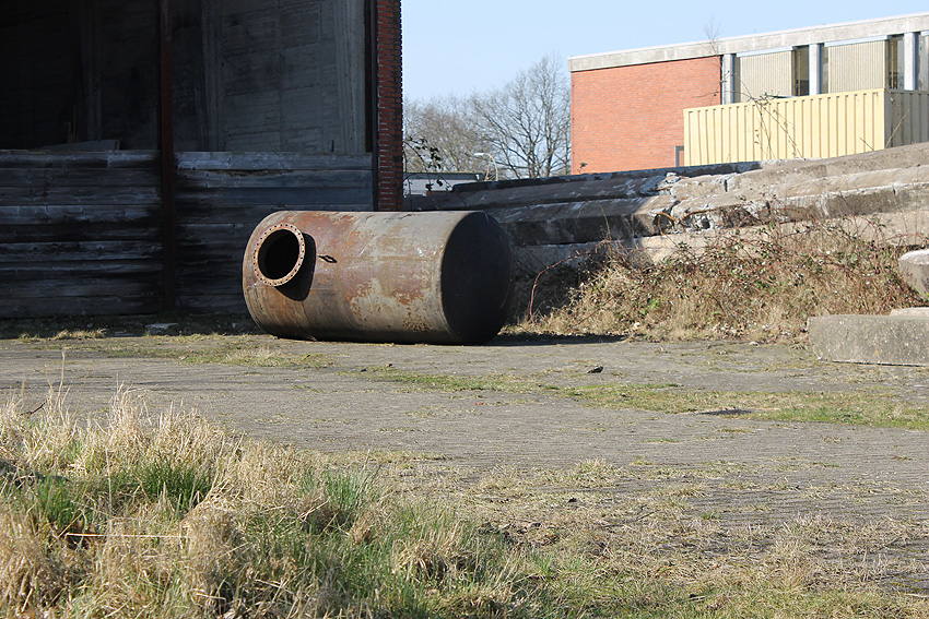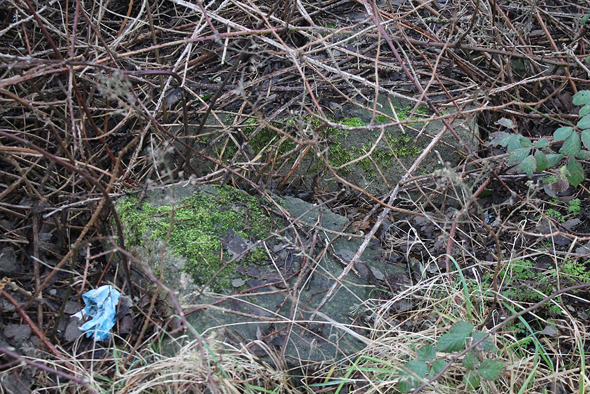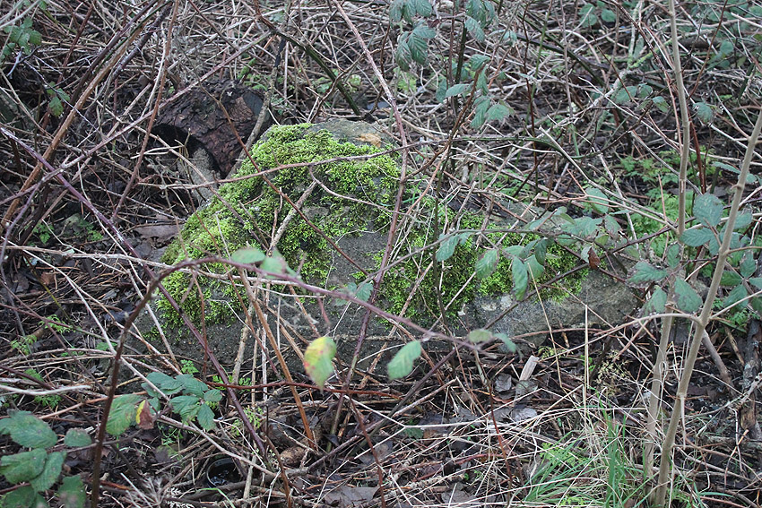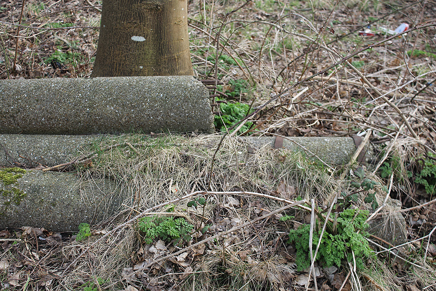 Nachtrag 12.02.18: Das "winkelförmige Massivbetonteil" hat sich nun als zwei nebeneinander liegende betonierte Tanks aus Nachkriegszeiten (BW) herausgestellt. Diese befanden sich ursprünglich unter Erdgleiche. Die beiden seitlich erkennbaren Öffnungen stellen Aufnahmen für Pumpleitungen / Abpumpen / Auffüllen eben dieser Boxen dar.