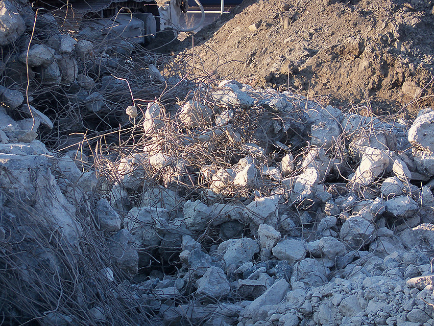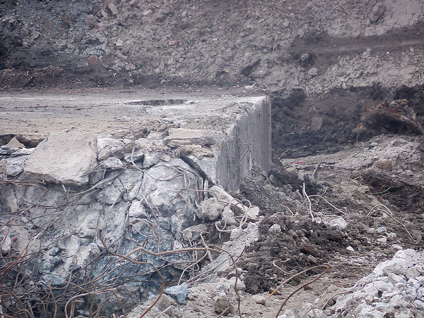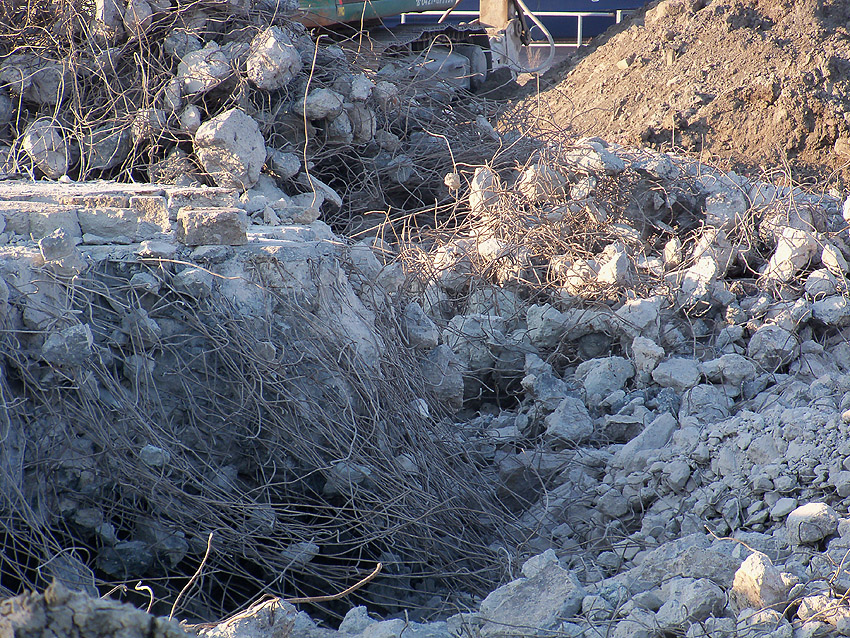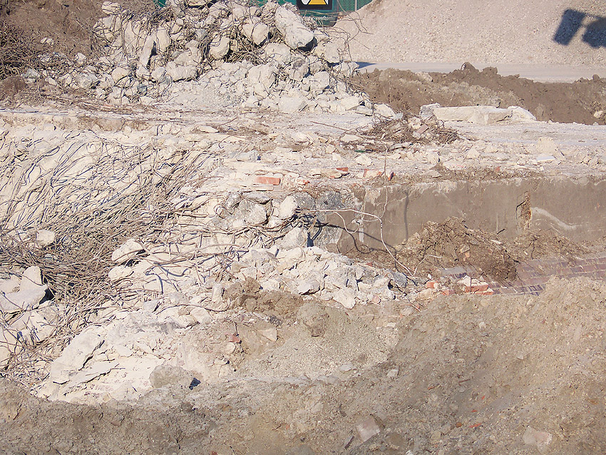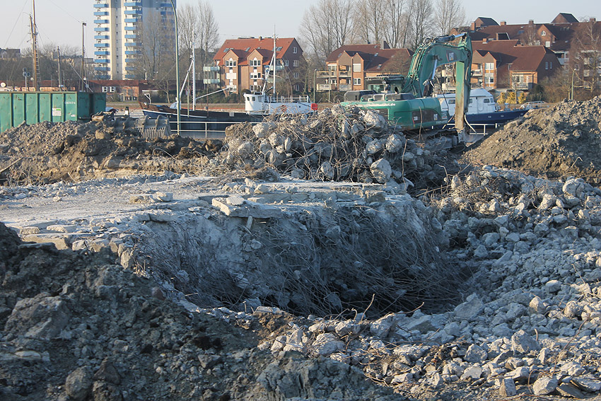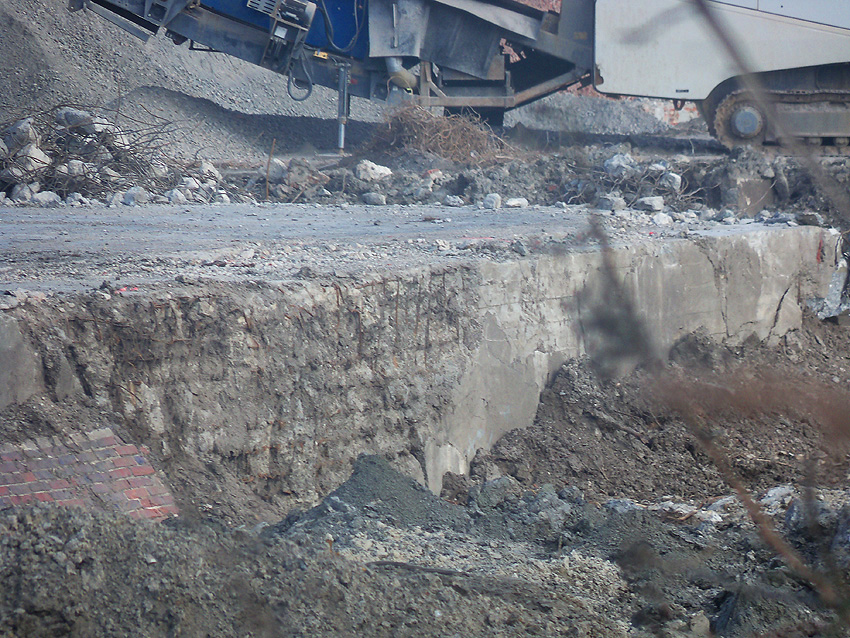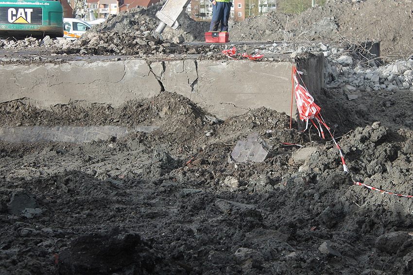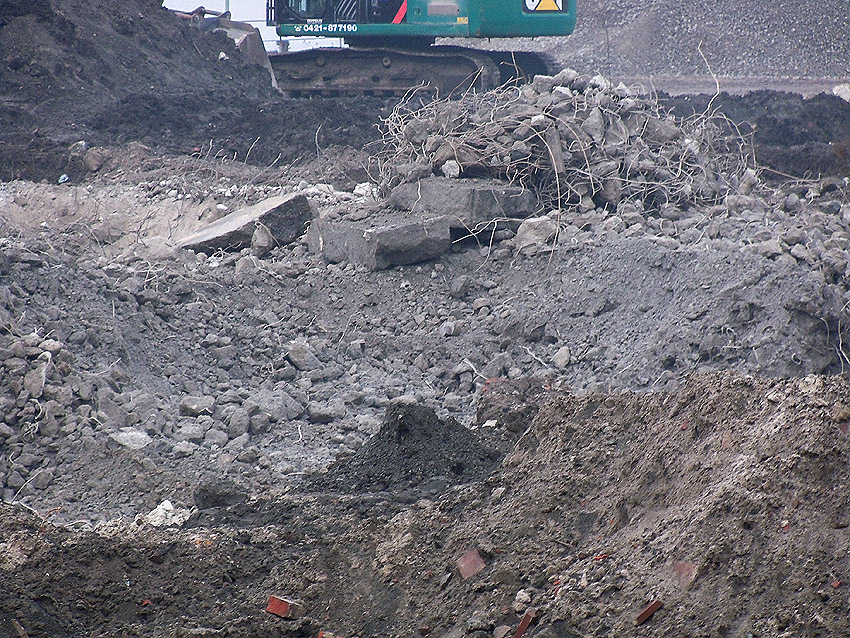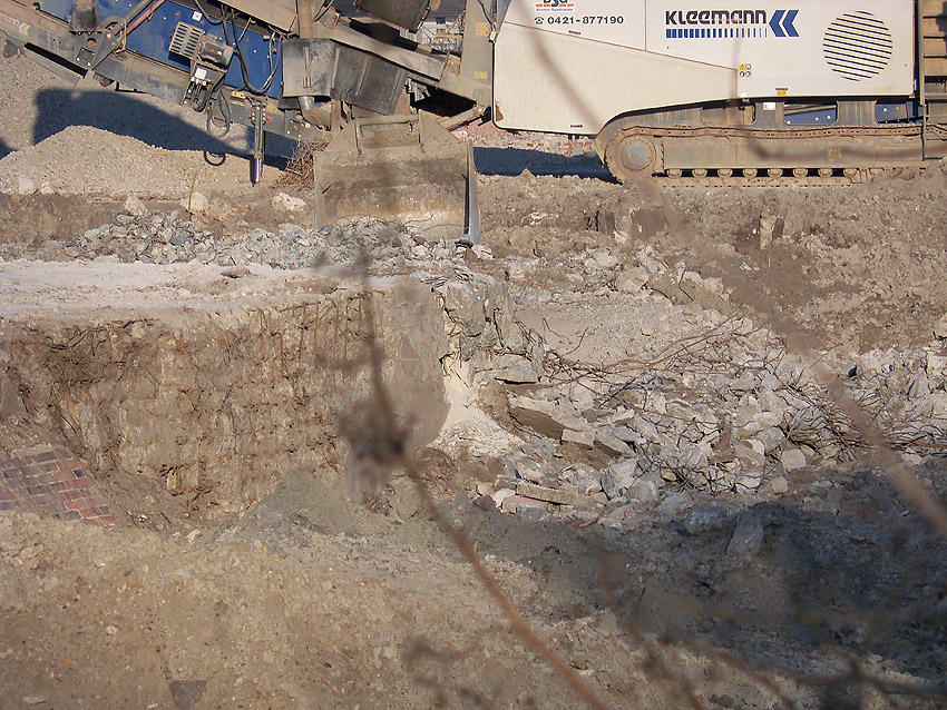 Mittlerweile ist die Decke des Tiefbunkers fast zur Hälfte abgebrochen. Zwei Bagger arbeiten sich mit dem Meißelhammer jeweils aus Osten und Norden vor. Die Höhe des Bunkers wurde inzwischen mit circa 5,50 Metern angegeben (+-1,50 m Decke - ohne nachträgliche Betonfertigträger - / 2,50 m Innenraumhöhe / 1,50 m Sohlplatte).