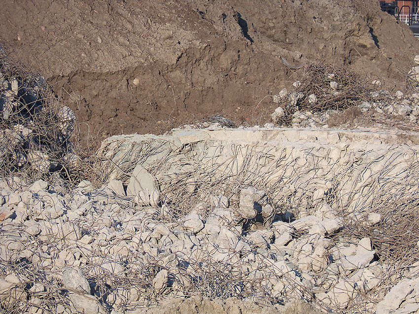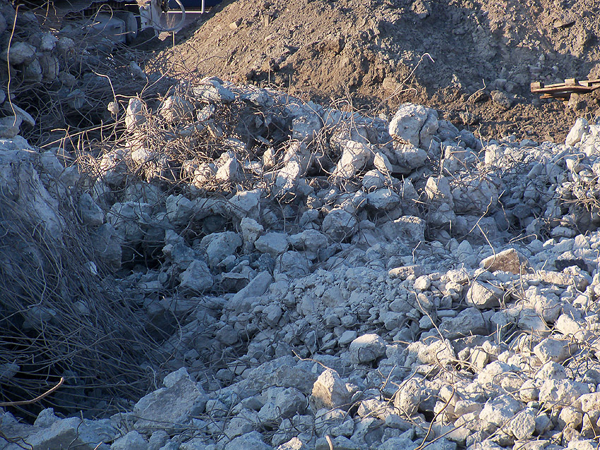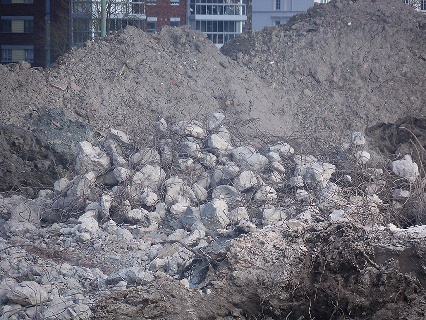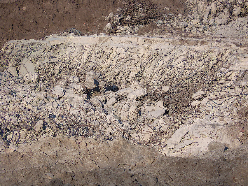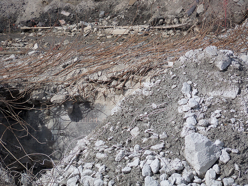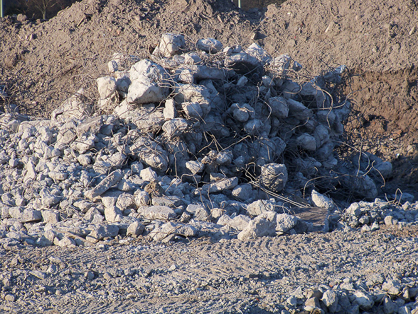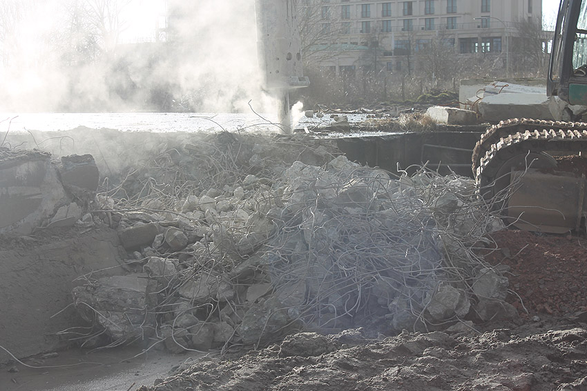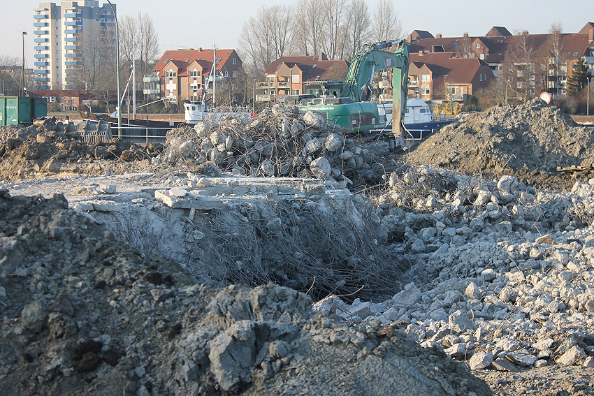 Mittlerweile ist die Decke des Tiefbunkers fast zur Hälfte abgebrochen. Zwei Bagger arbeiten sich mit dem Meißelhammer jeweils aus Osten und Norden vor. Die Höhe des Bunkers wurde inzwischen mit circa 5,50 Metern angegeben (+-1,50 m Decke - ohne nachträgliche Betonfertigträger - / 2,50 m Innenraumhöhe / 1,50 m Sohlplatte).