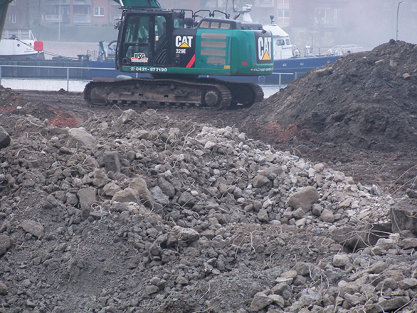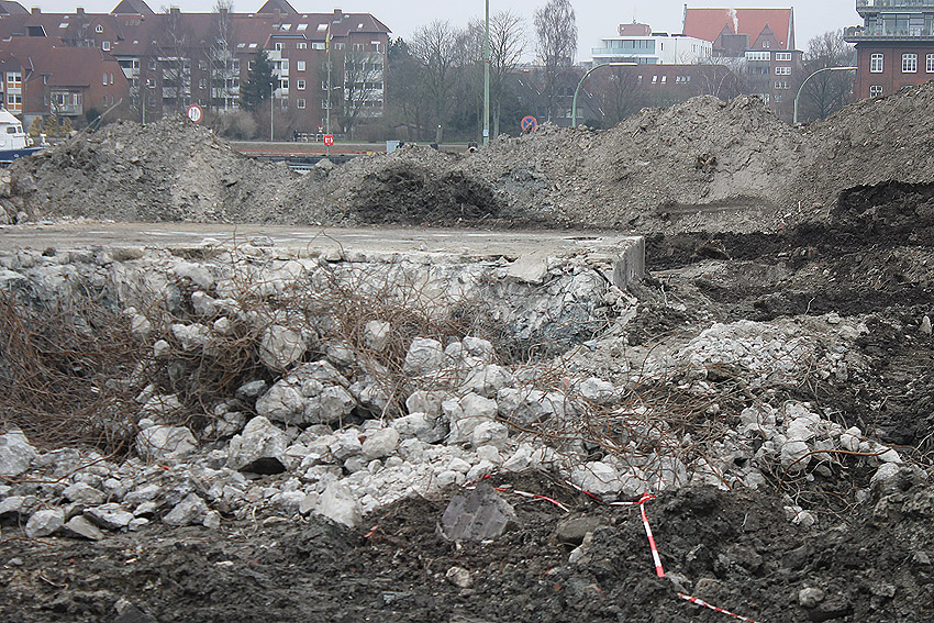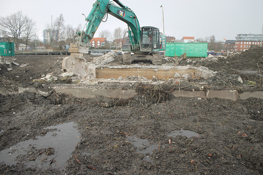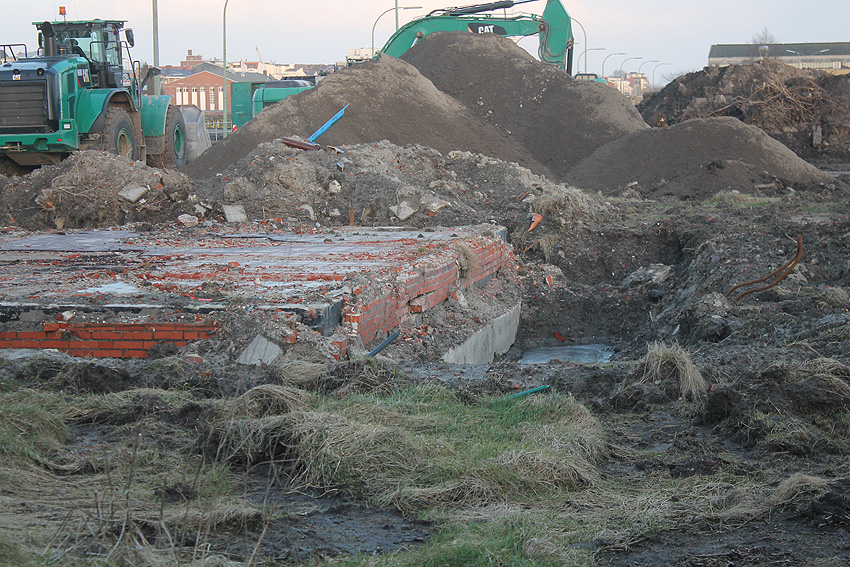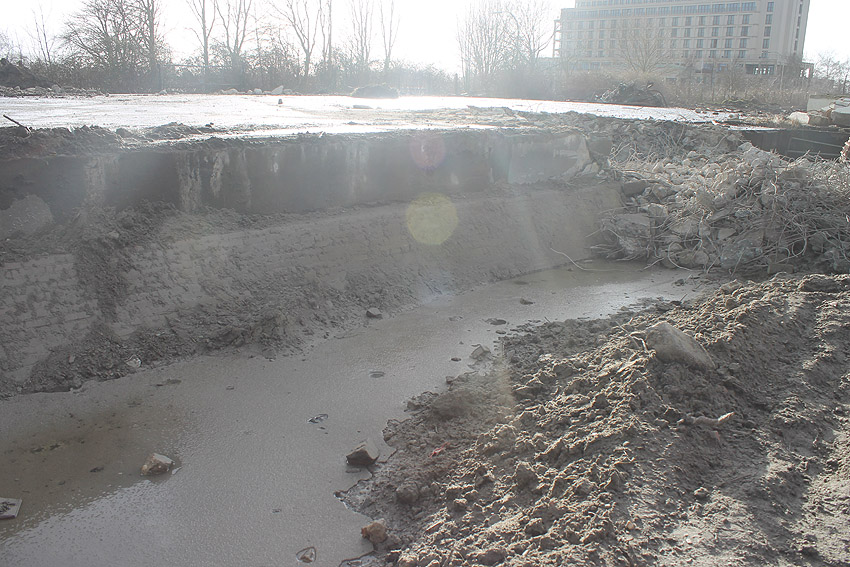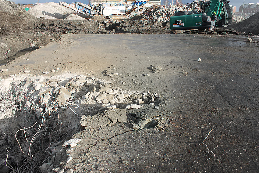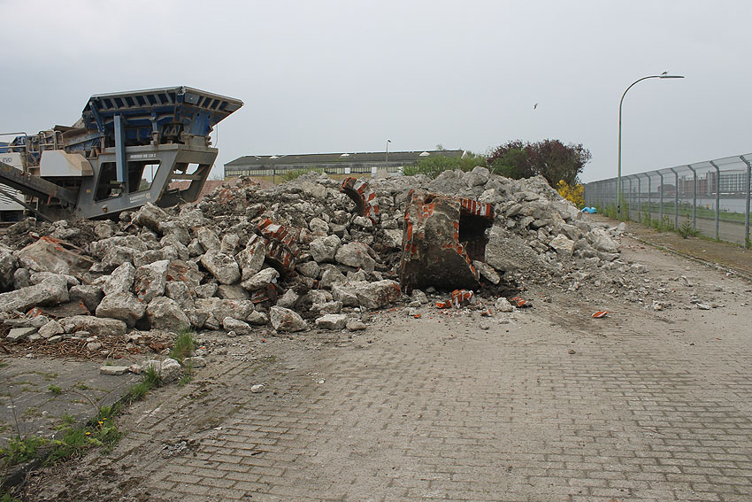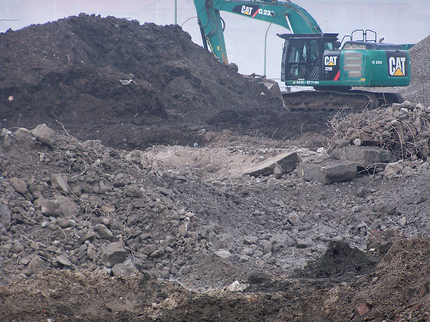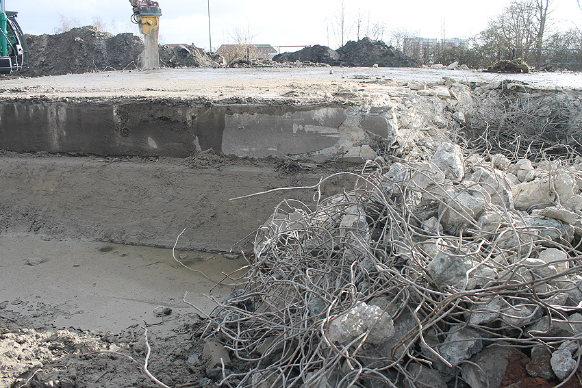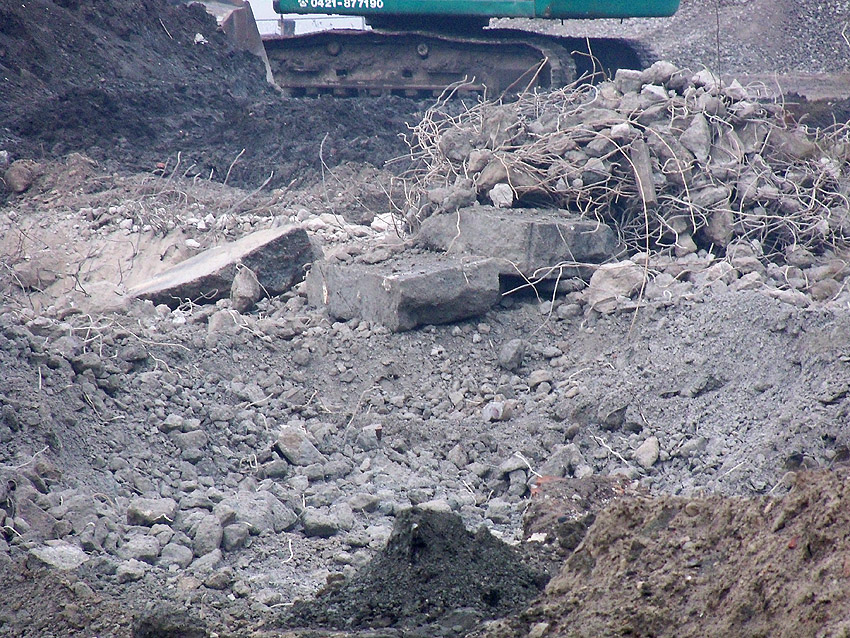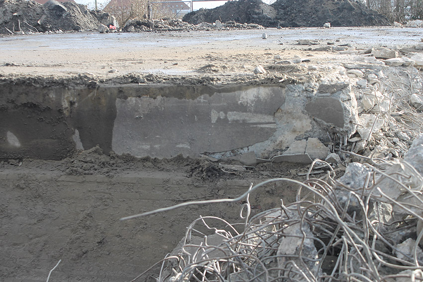 Die Sohlplatte des Tiefbunkers wird weiter abgebrochen. Hinweis: Die vermuteten Kranaufnahmen aus Stahlbeton, welche sich östlich des Bunkers befanden, wurden bereits vor einigen Wochen entfernt. Die Reste der Nordwestwand des Bunkers mit dem letzten "Rauchen verboten"-Schriftzug sind vor knapp zwei Wochen zerkleinert worden.
