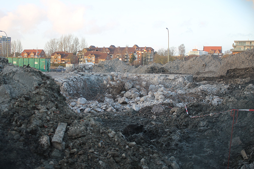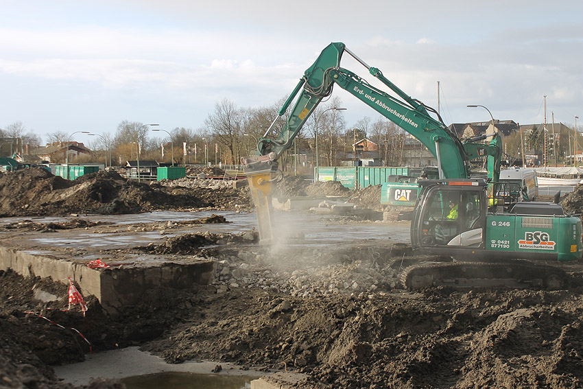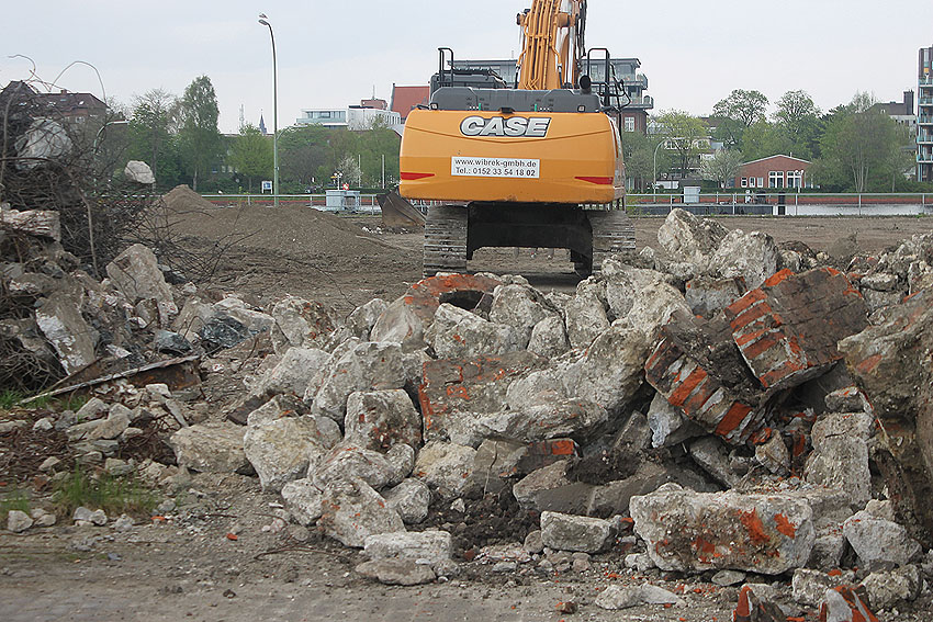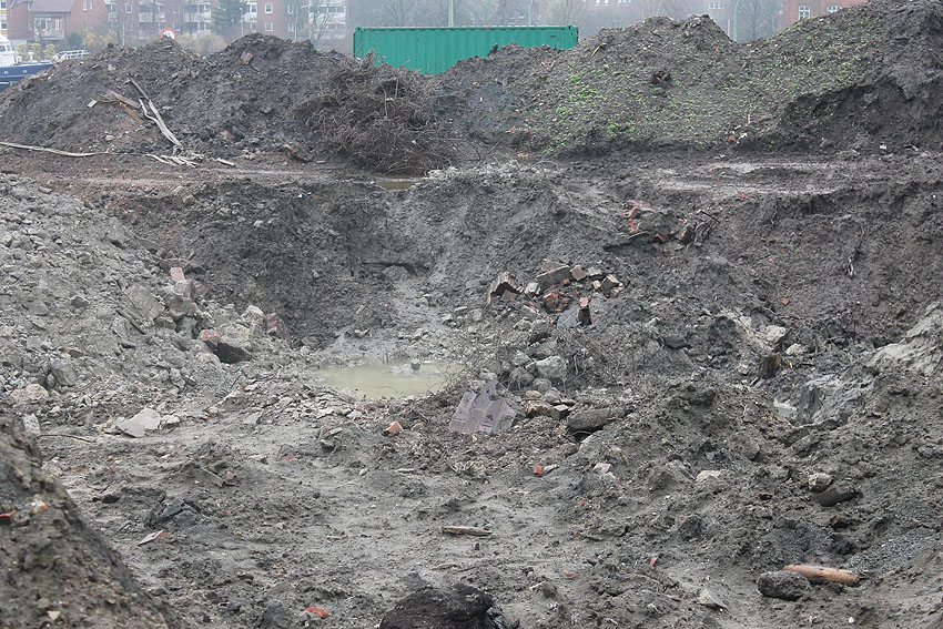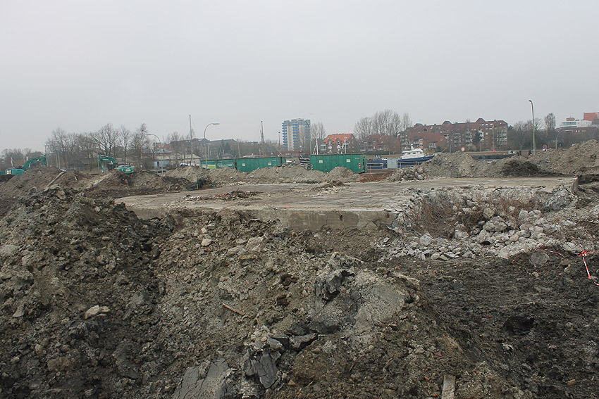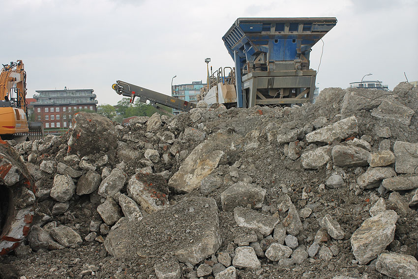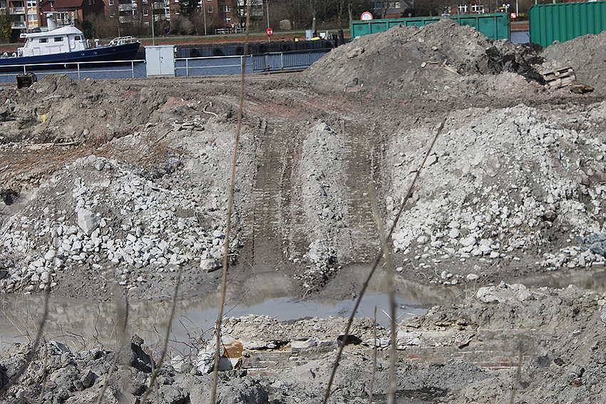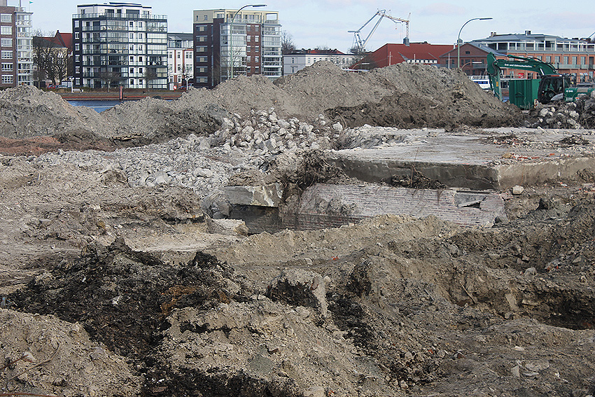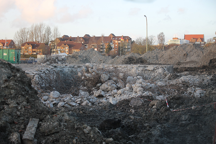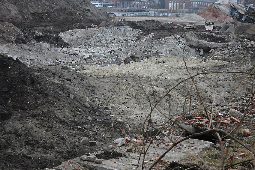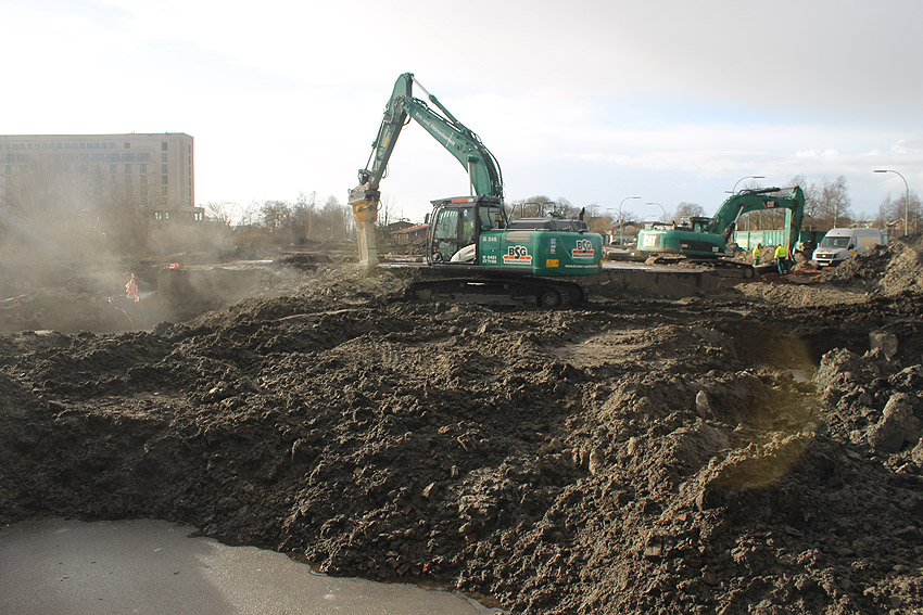 Die Sohlplatte des Tiefbunkers wird weiter abgebrochen. Hinweis: Die vermuteten Kranaufnahmen aus Stahlbeton, welche sich östlich des Bunkers befanden, wurden bereits vor einigen Wochen entfernt. Die Reste der Nordwestwand des Bunkers mit dem letzten "Rauchen verboten"-Schriftzug sind vor knapp zwei Wochen zerkleinert worden.