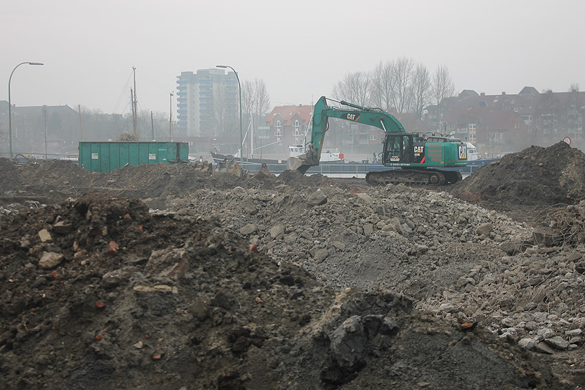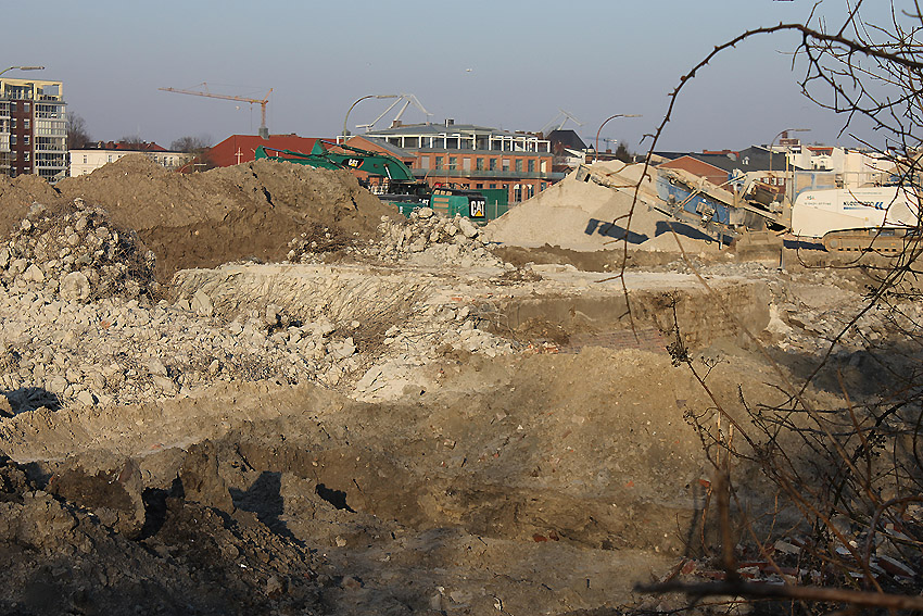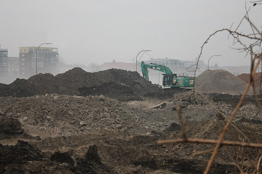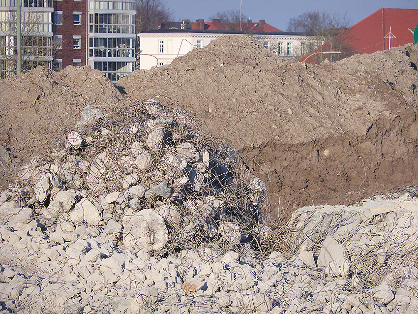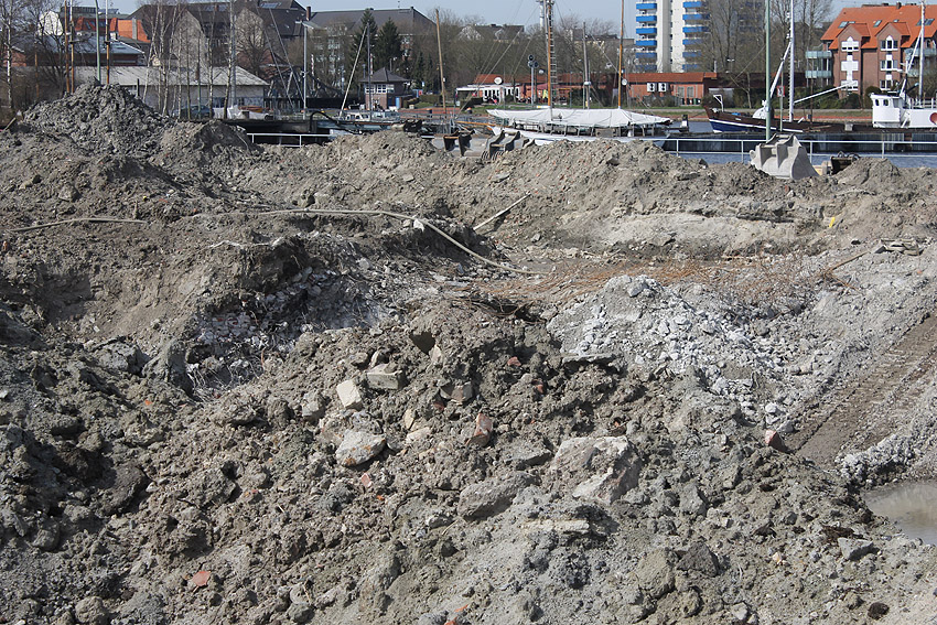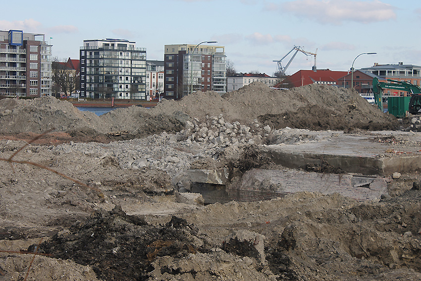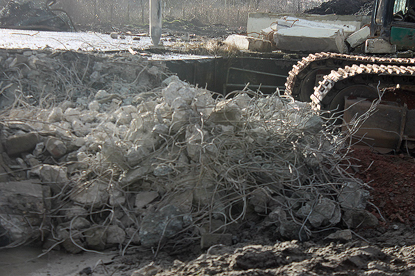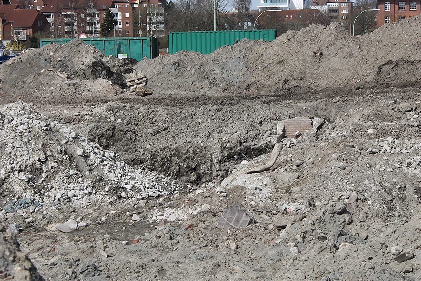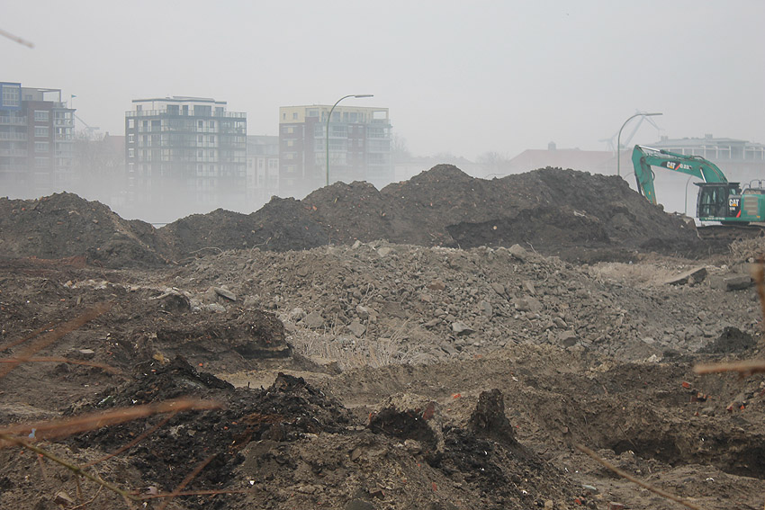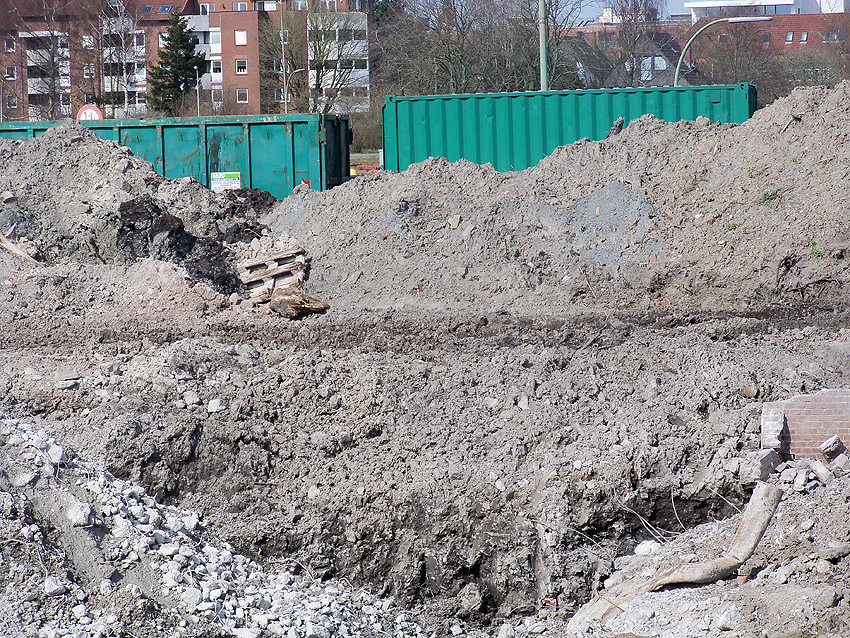 Die Sohlplatte des Tiefbunkers wird weiter abgebrochen. Hinweis: Die vermuteten Kranaufnahmen aus Stahlbeton, welche sich östlich des Bunkers befanden, wurden bereits vor einigen Wochen entfernt. Die Reste der Nordwestwand des Bunkers mit dem letzten "Rauchen verboten"-Schriftzug sind vor knapp zwei Wochen zerkleinert worden.