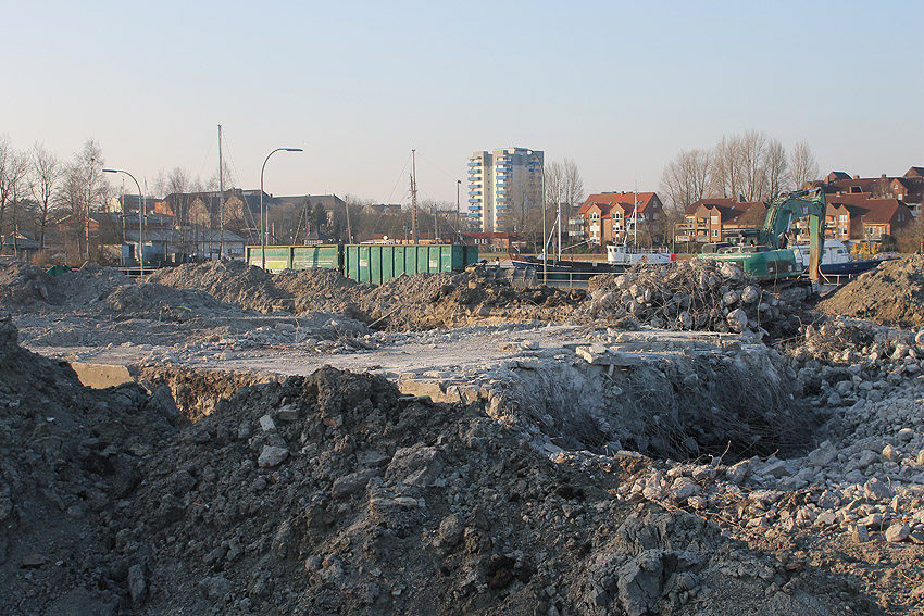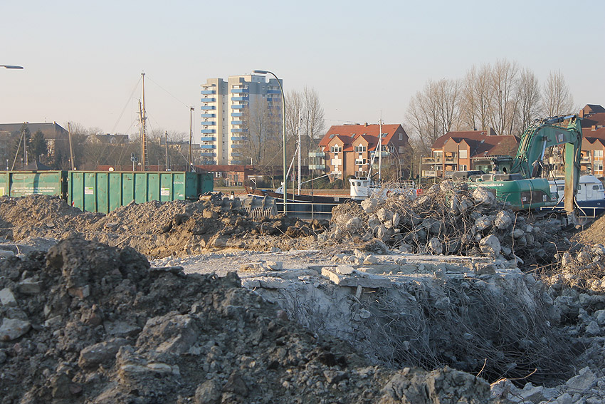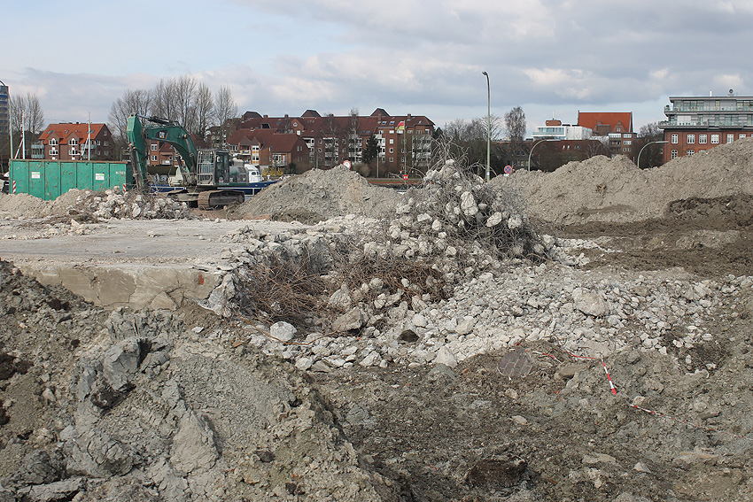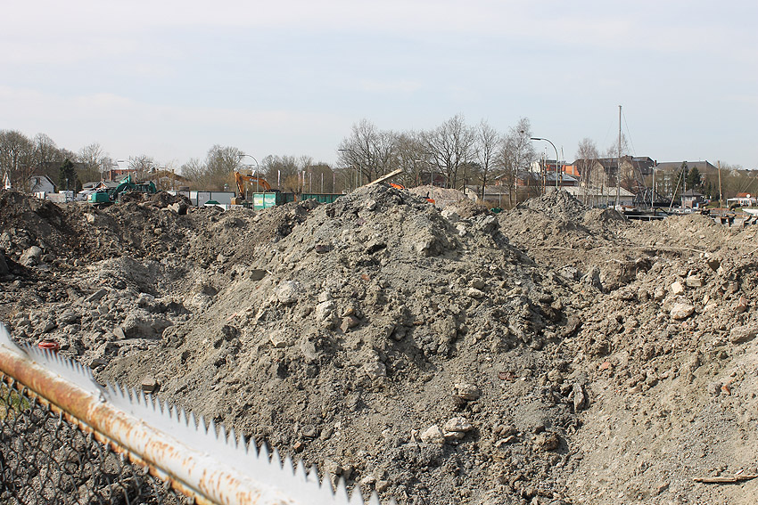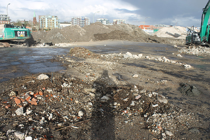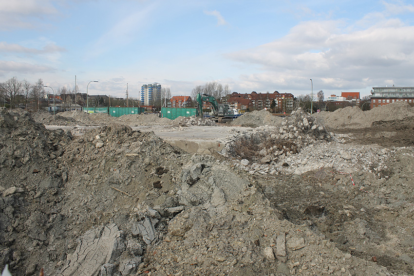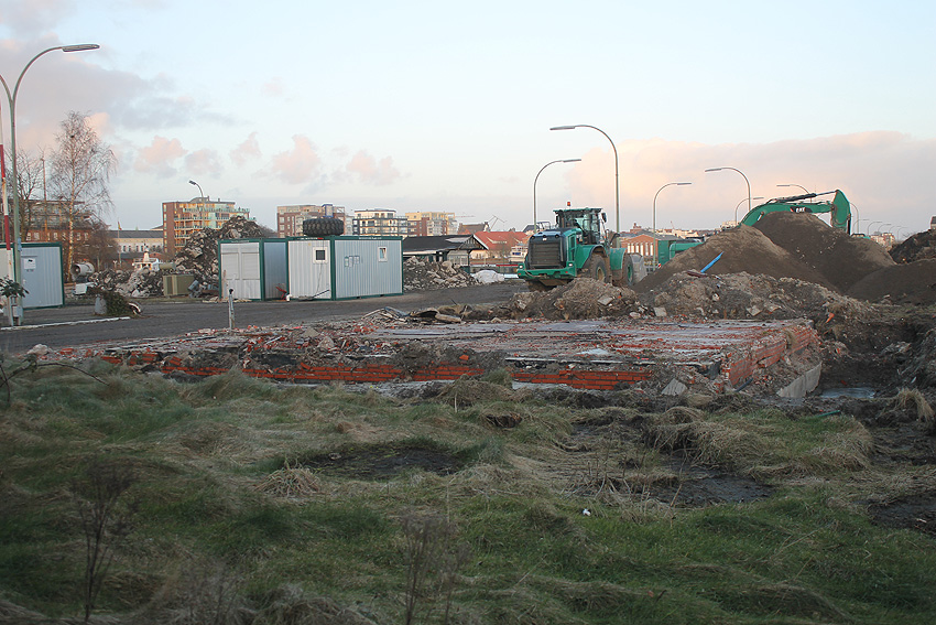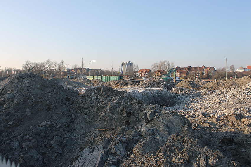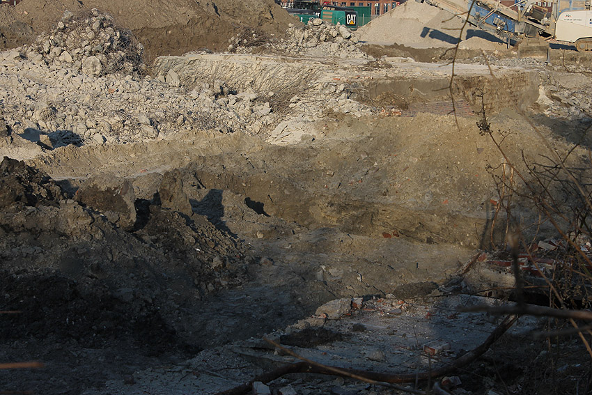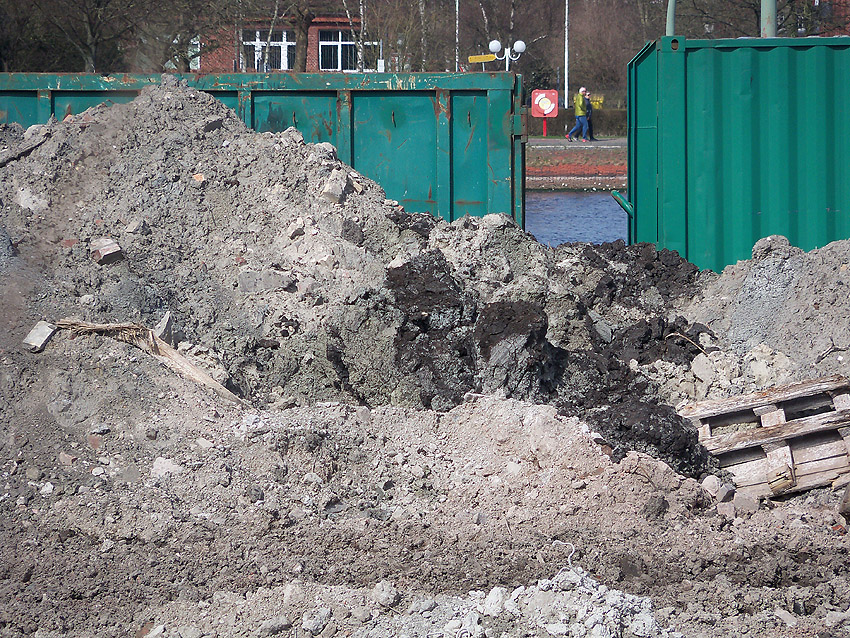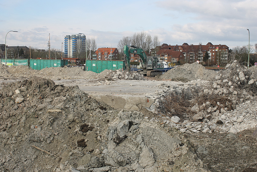 Die Sohlplatte des Tiefbunkers wird weiter abgebrochen. Hinweis: Die vermuteten Kranaufnahmen aus Stahlbeton, welche sich östlich des Bunkers befanden, wurden bereits vor einigen Wochen entfernt. Die Reste der Nordwestwand des Bunkers mit dem letzten "Rauchen verboten"-Schriftzug sind vor knapp zwei Wochen zerkleinert worden.