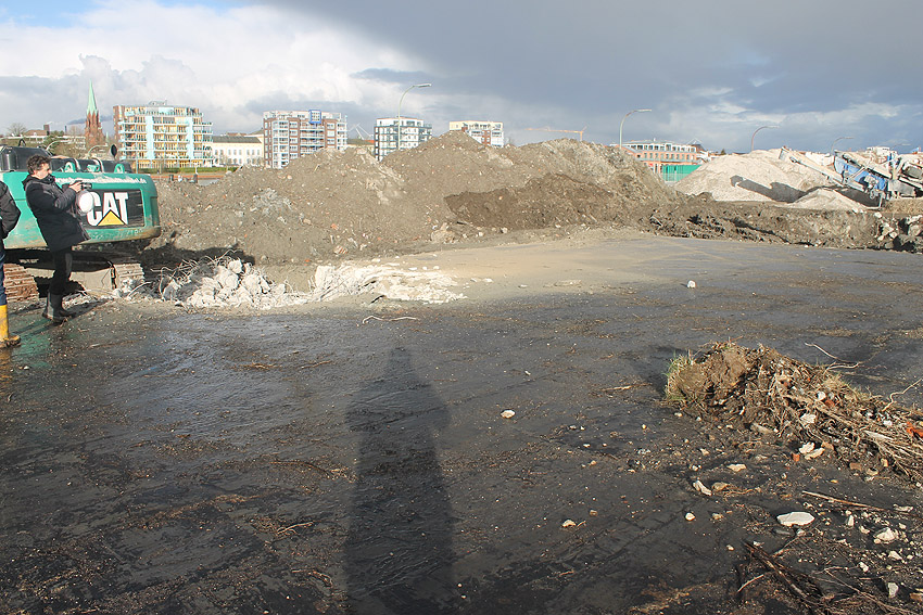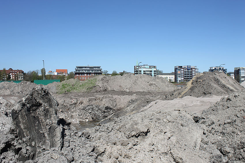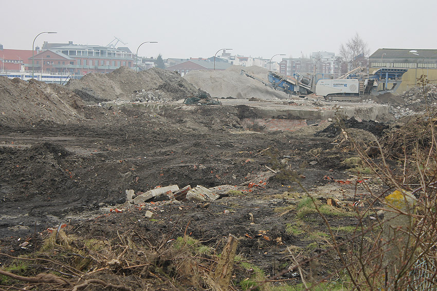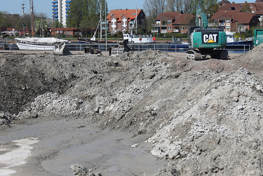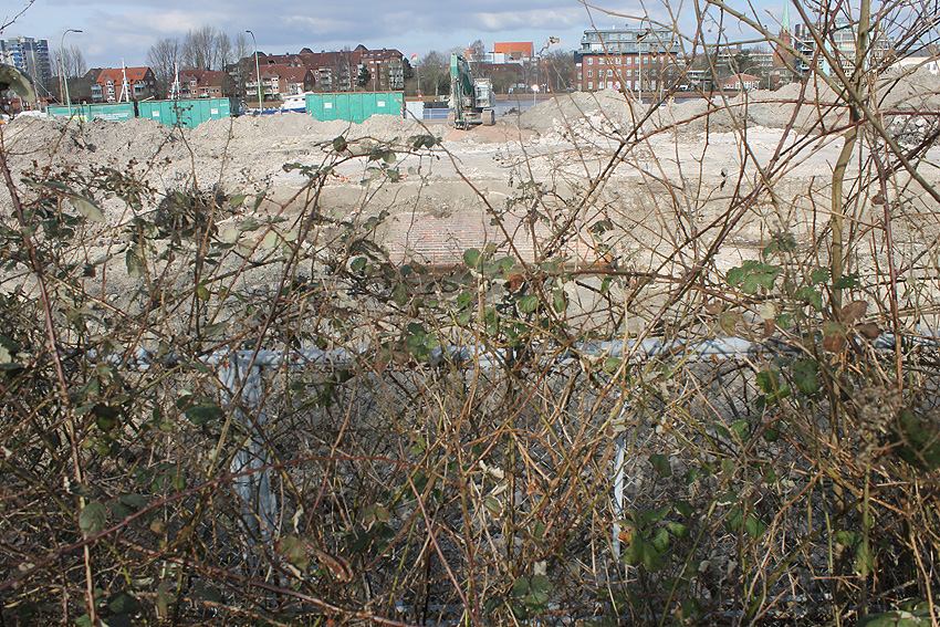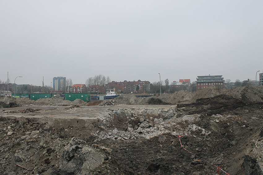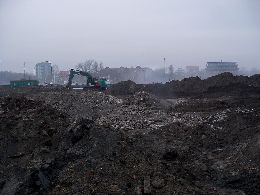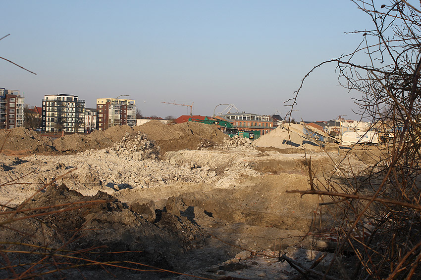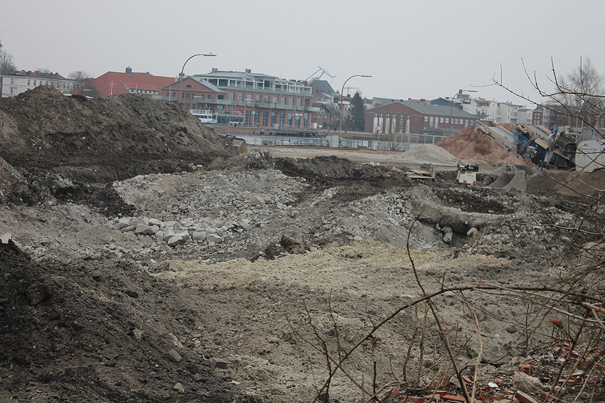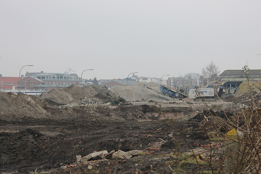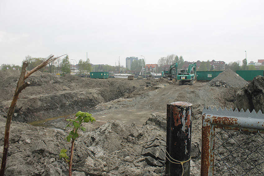 Die Sohlplatte des Tiefbunkers wird weiter abgebrochen. Hinweis: Die vermuteten Kranaufnahmen aus Stahlbeton, welche sich östlich des Bunkers befanden, wurden bereits vor einigen Wochen entfernt. Die Reste der Nordwestwand des Bunkers mit dem letzten "Rauchen verboten"-Schriftzug sind vor knapp zwei Wochen zerkleinert worden.