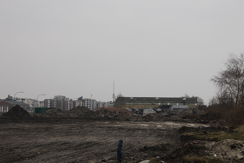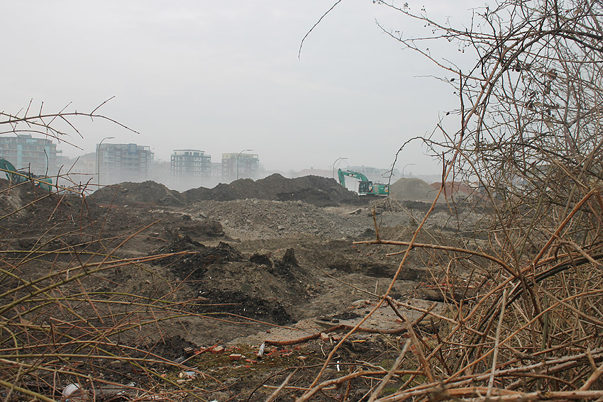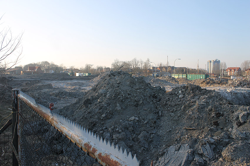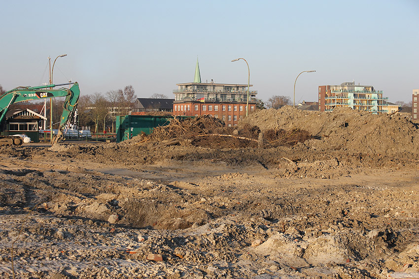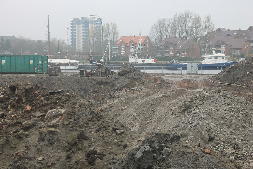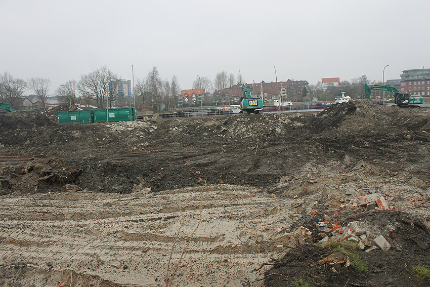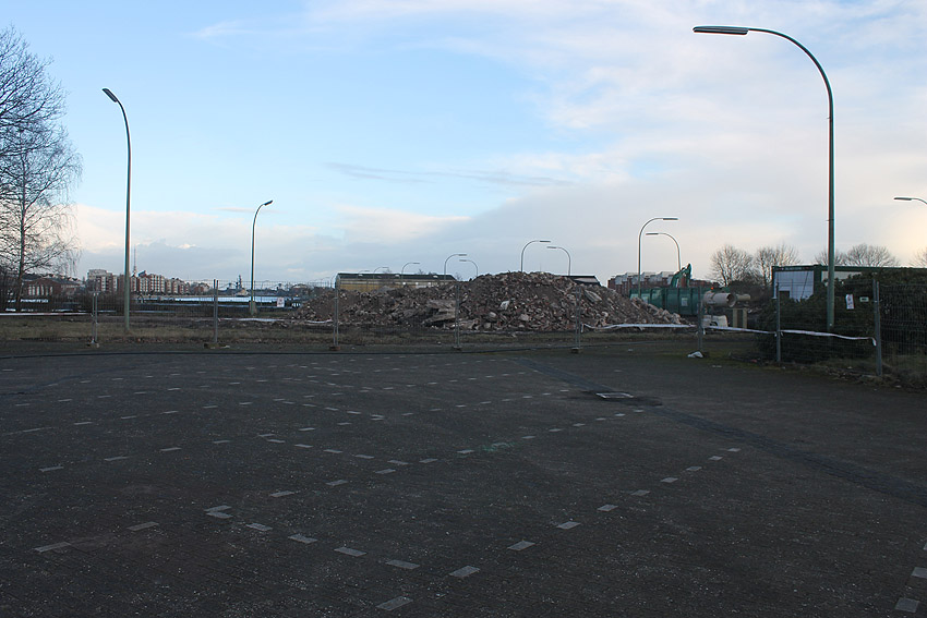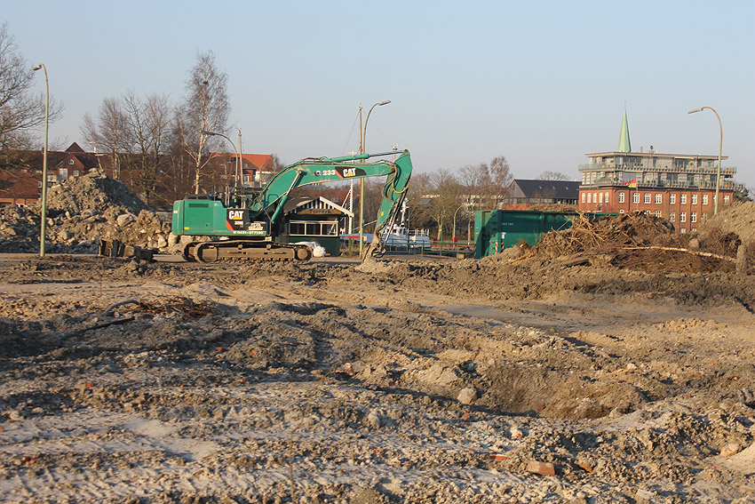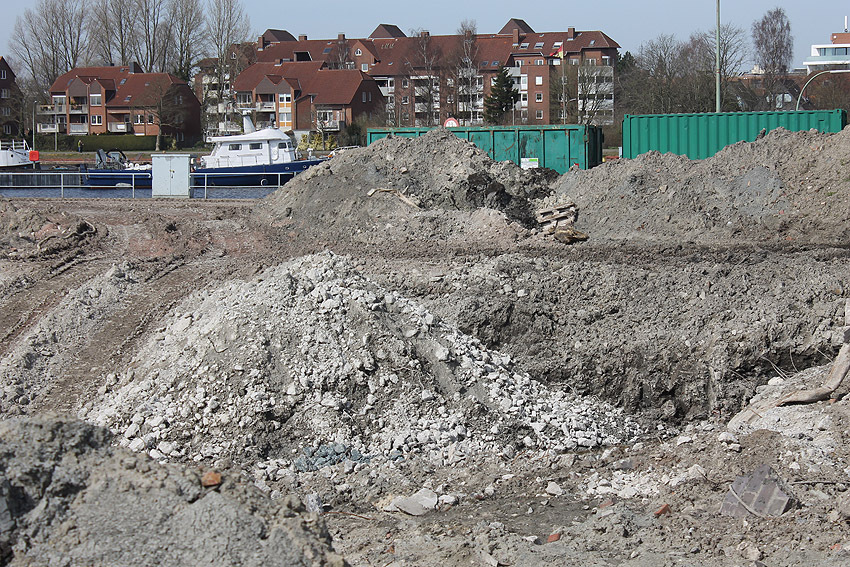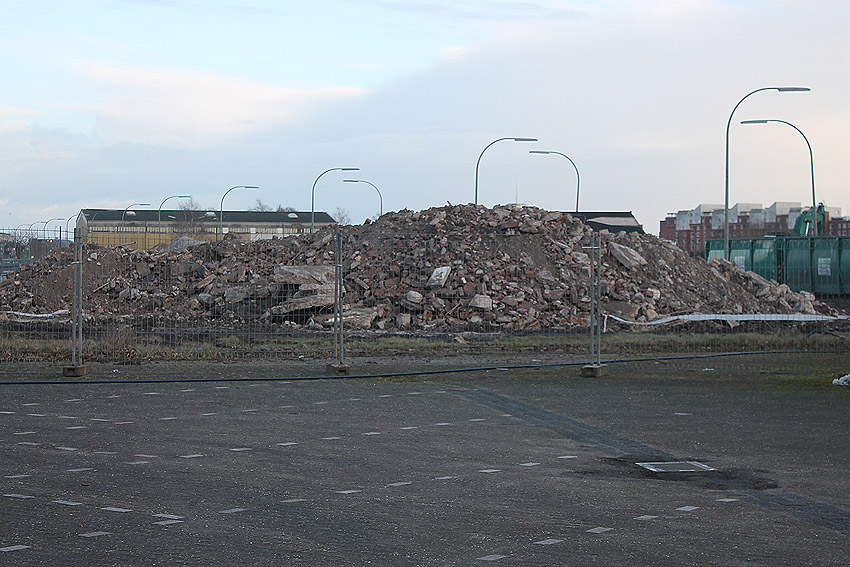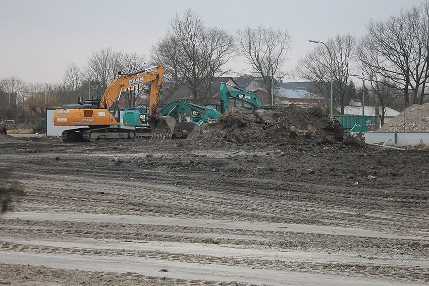 Die Sohlplatte des Tiefbunkers wird weiter abgebrochen. Hinweis: Die vermuteten Kranaufnahmen aus Stahlbeton, welche sich östlich des Bunkers befanden, wurden bereits vor einigen Wochen entfernt. Die Reste der Nordwestwand des Bunkers mit dem letzten "Rauchen verboten"-Schriftzug sind vor knapp zwei Wochen zerkleinert worden.