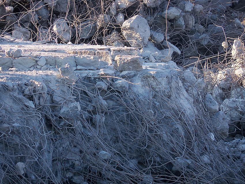 Oben / Unten: Noch einmal der zweite, südliche Eingang, der leicht nach Osten versetzt im Verhältnis zum Nordeingang eingebracht wurde. Zu sehen ist auch der zugeschüttete Treppenabgangsbereich (dunkle rechteckige Fläche mittig des Vorbaues / gleiche Ausrichtung wie Eingang Nord).