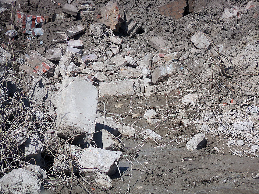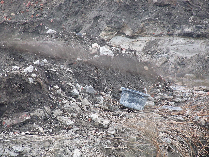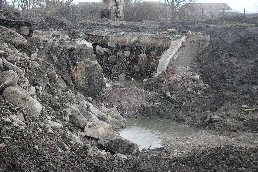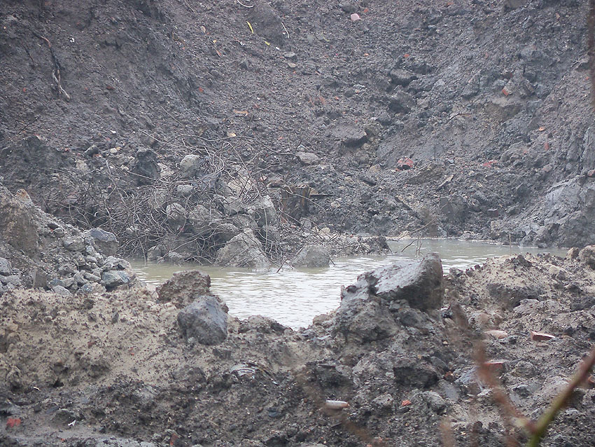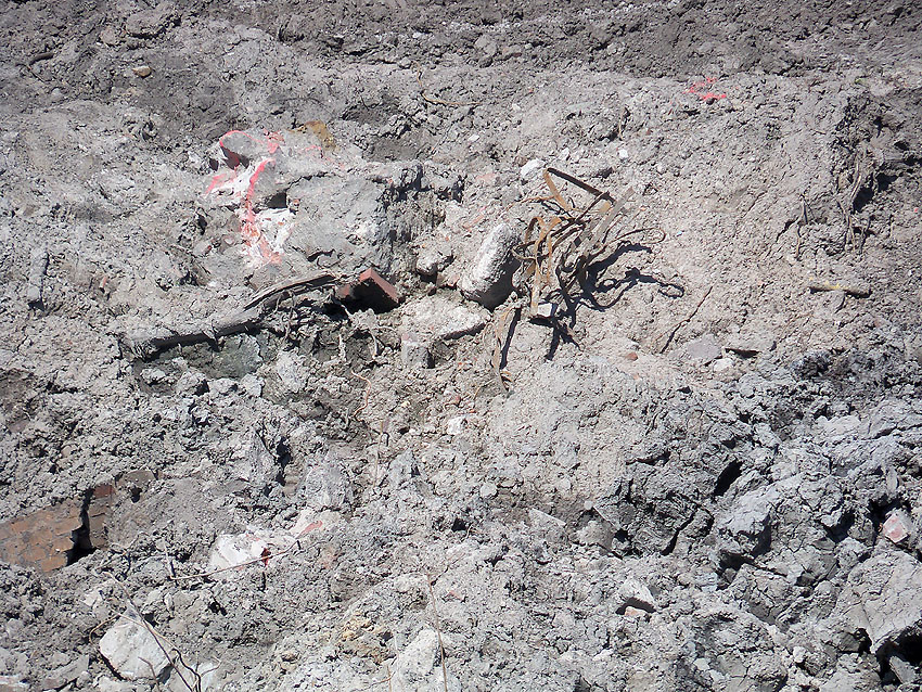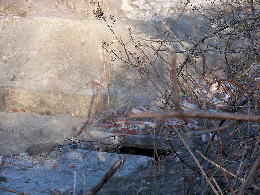 Nicht unerhebliche Teile der Ostdachecke des Tiefbunkers sind bereits abgerissen. An Objekt 2, welches wohl eine Zisterne darstellte, erinnert nur noch eine Erdkuhle mit einigen Trümmerstücken.