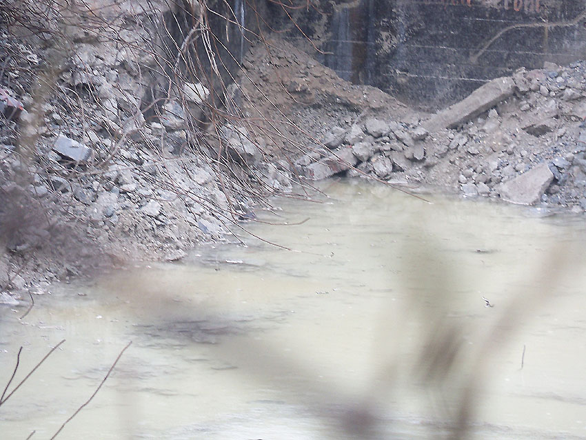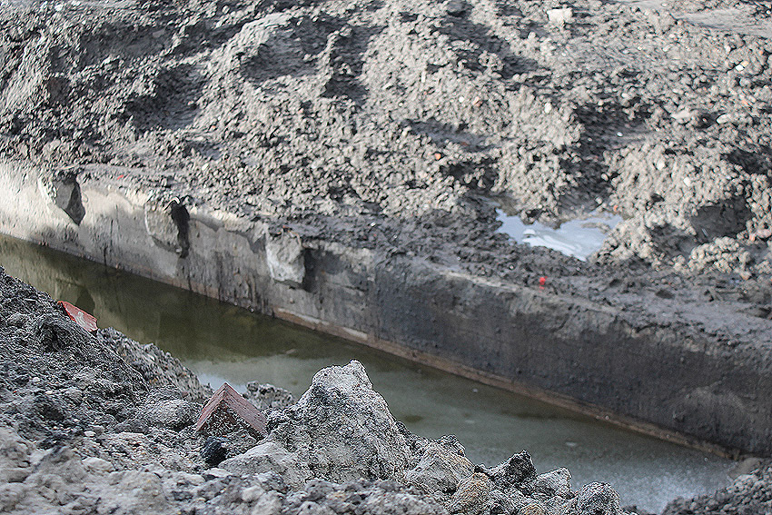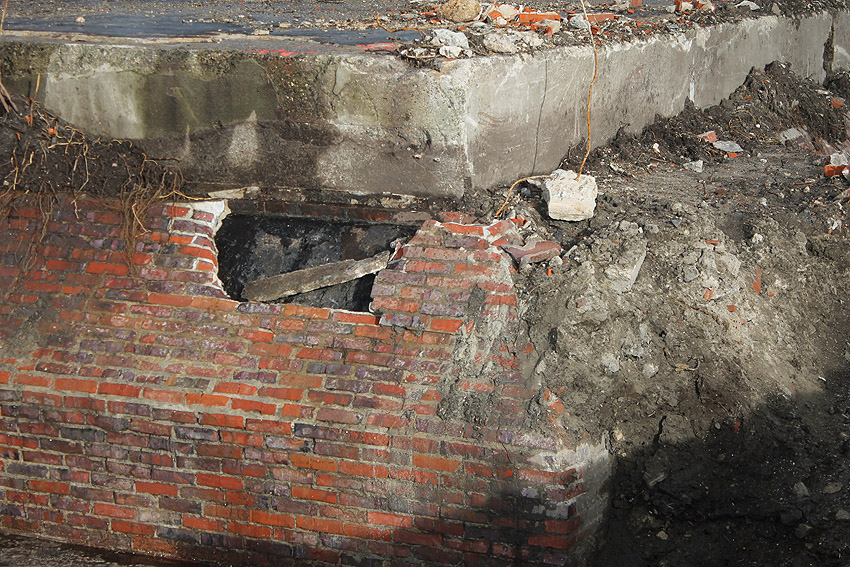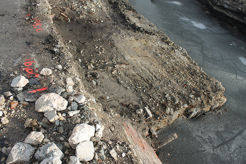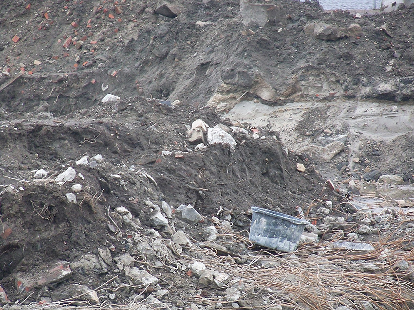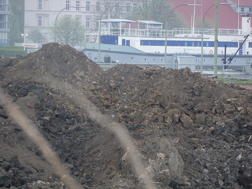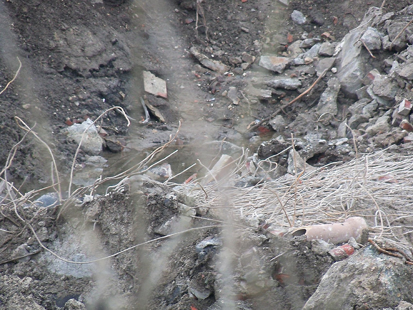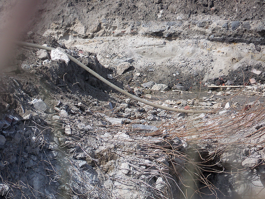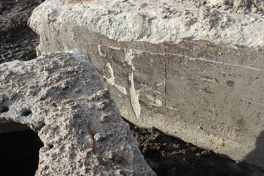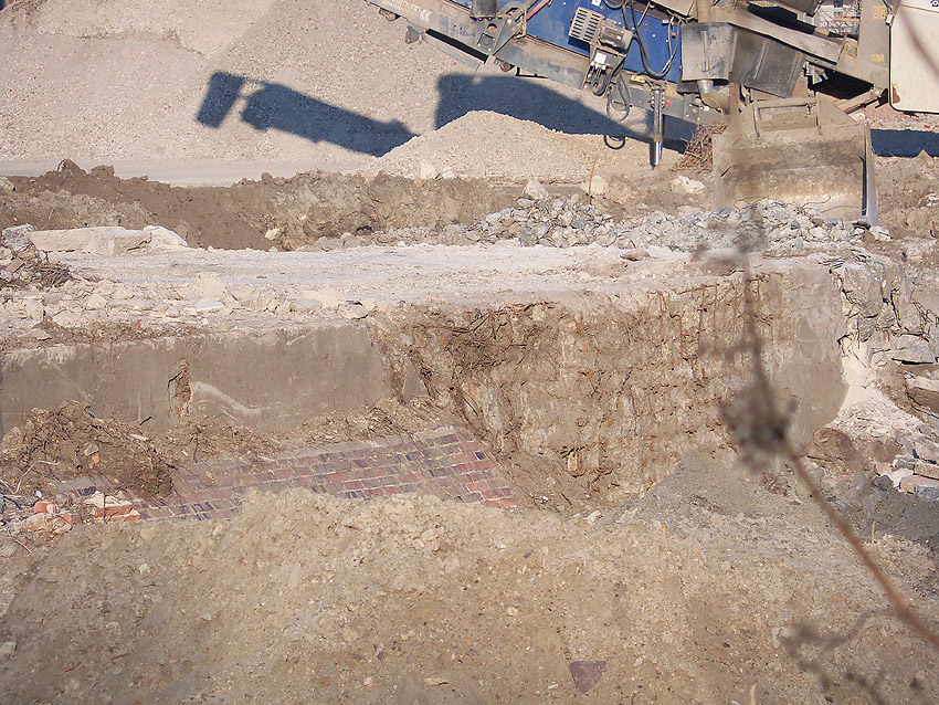 Im Mittelbereich der Wiesbadenbrücke wurde noch einmal "ein Loch gegraben". Hier traten wieder massive Beton- und Mauerwerksteile ans Tageslicht. Es dürfte sich dabei um Reste der Fernwärmeleitungsanlage aus Nachkriegszeiten handeln: