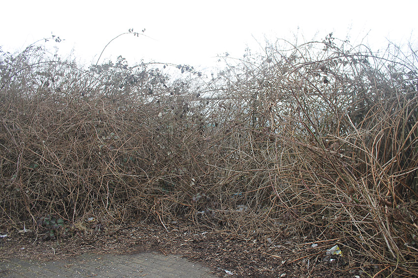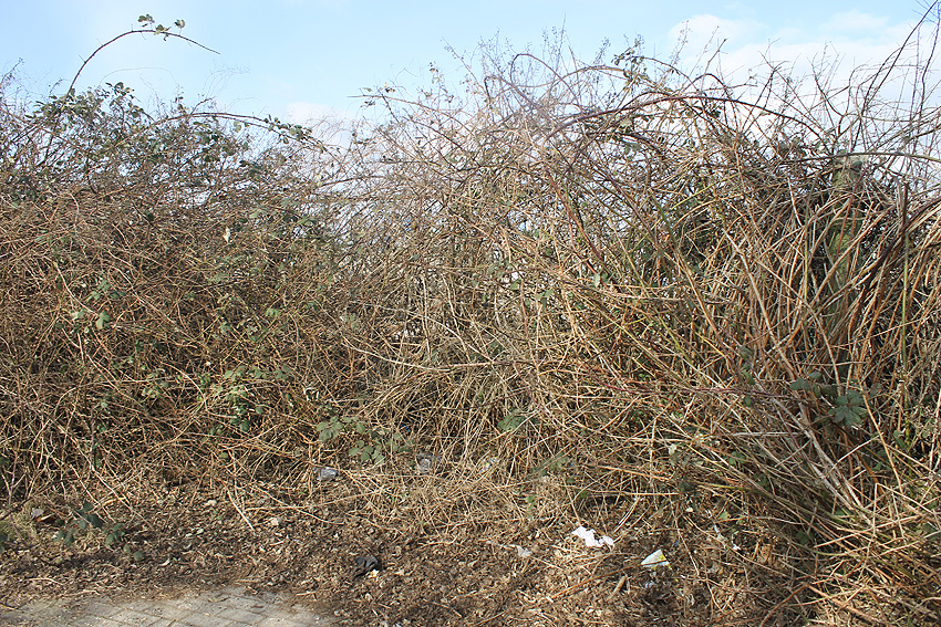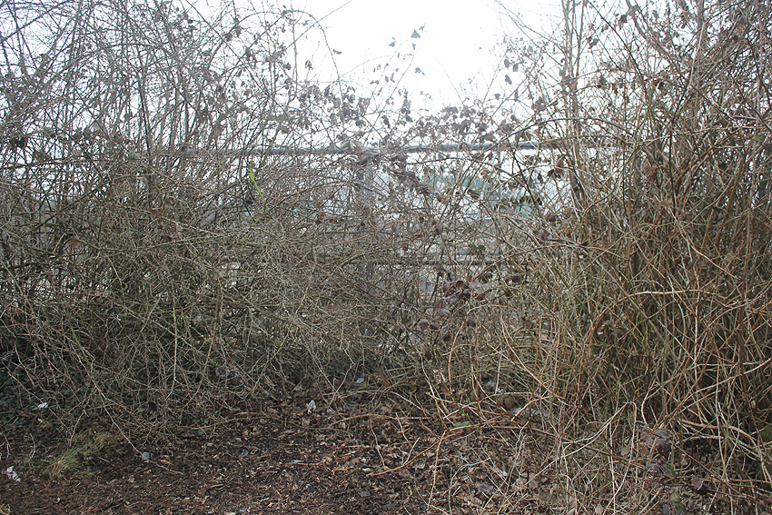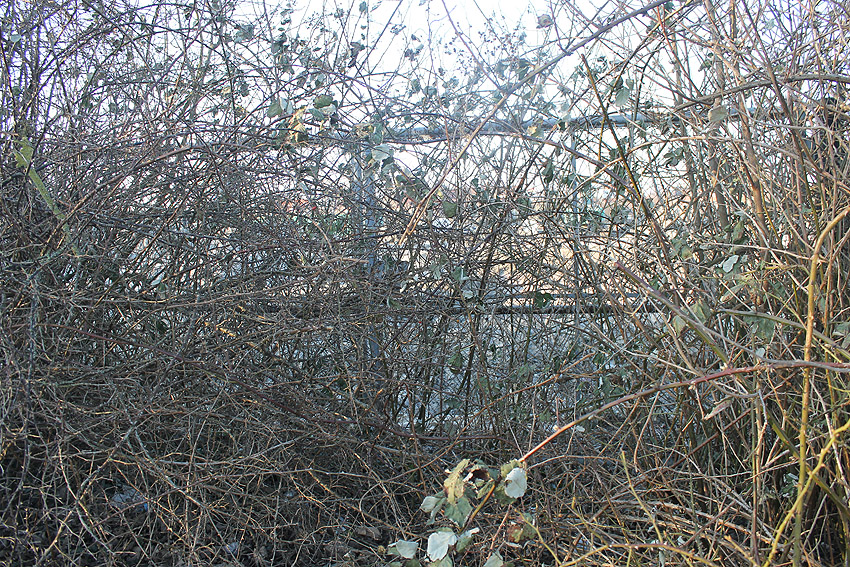 Im mittleren (1x) und östlichen Bereich (2x / nebeneinander) des Zaunes der Südbegrenzung des BW-Bereiches gab es insgesamt drei Südtore. Hier ist das erste im Mittelbereich fast völlig zugewachsen zu sehen.