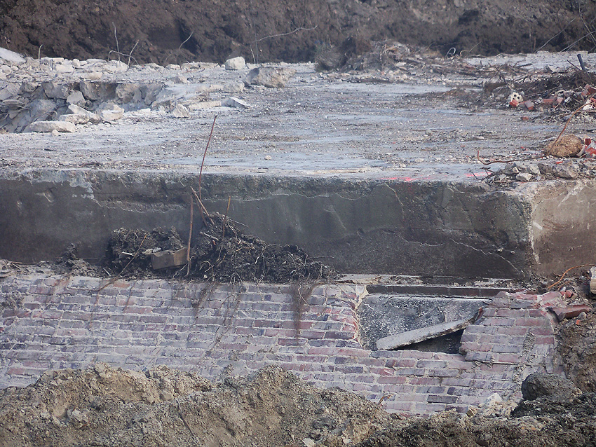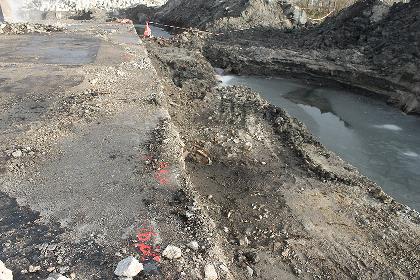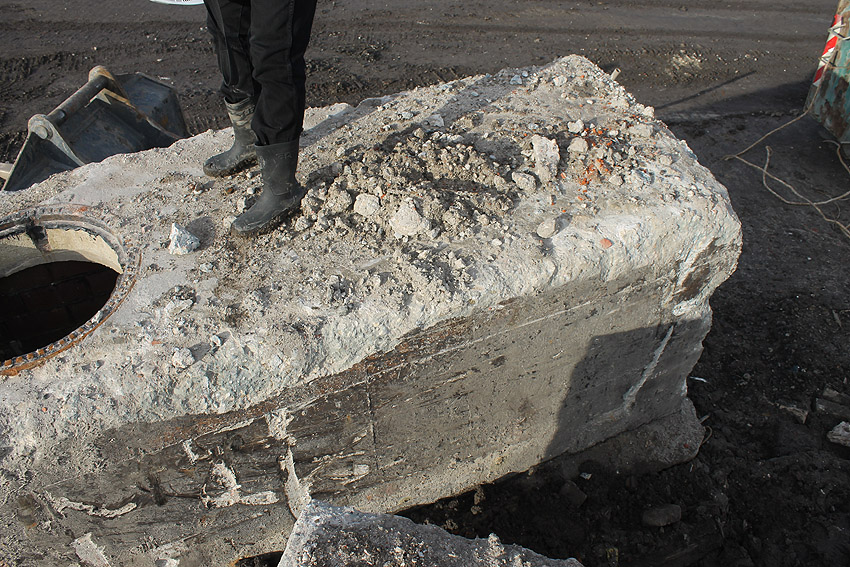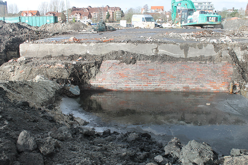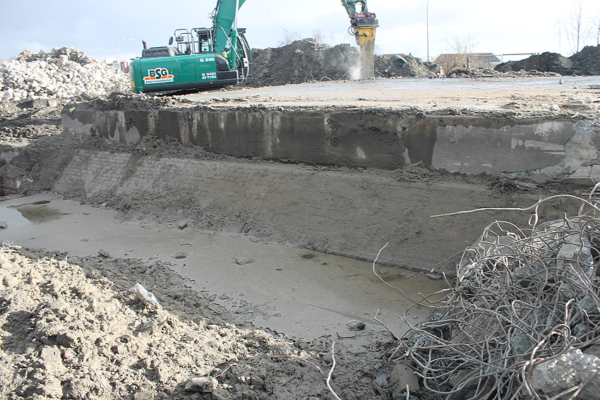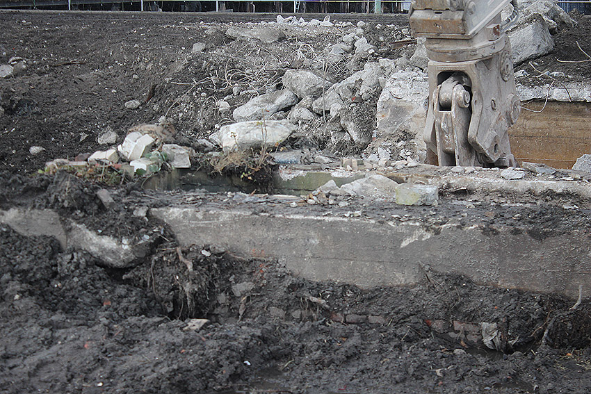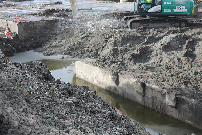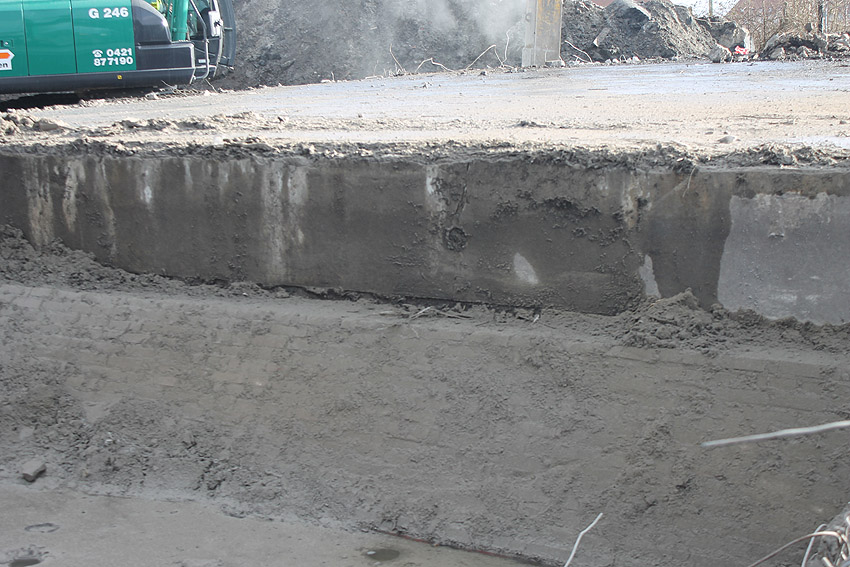 Wider Erwarten sind bis dato doch noch große Teile der Bodenplatte des Tiefbunkers erhalten geblieben. Nachdem das Grubenwasser nun abgepumpt wurde, ist die Platte freigelegt worden. Deren Abbruch ist in Arbeit.