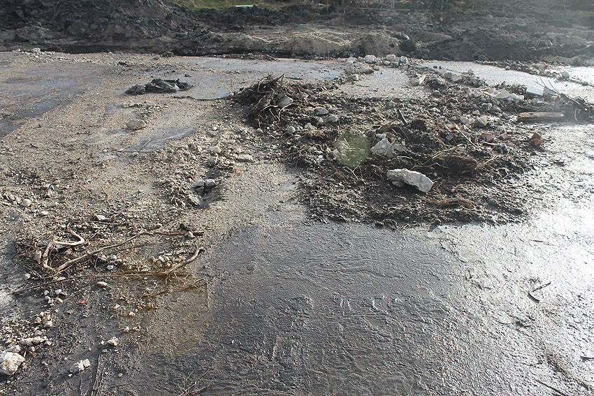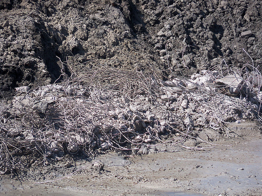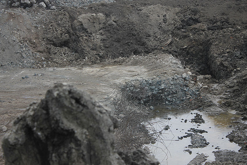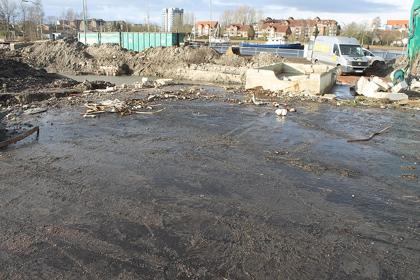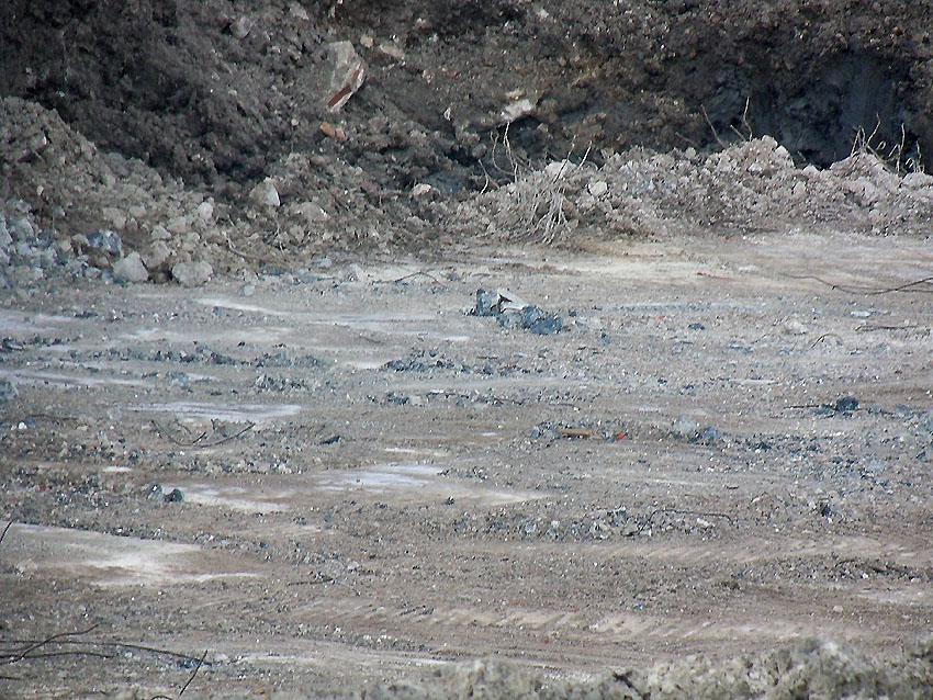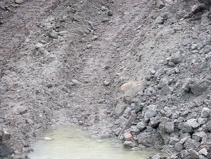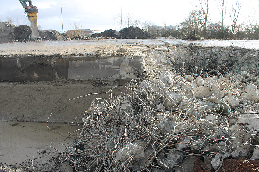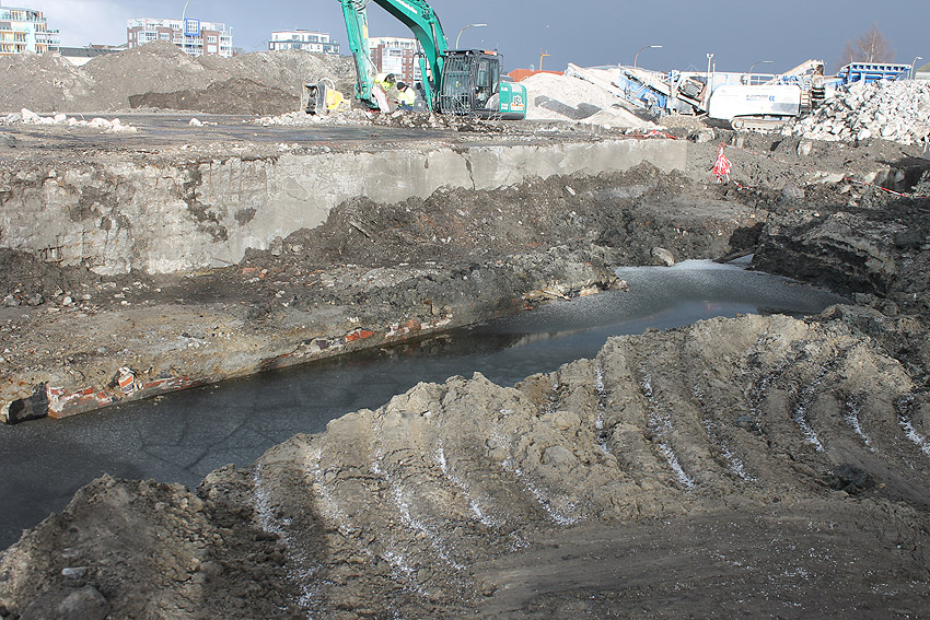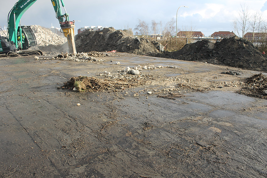 Wider Erwarten sind bis dato doch noch große Teile der Bodenplatte des Tiefbunkers erhalten geblieben. Nachdem das Grubenwasser nun abgepumpt wurde, ist die Platte freigelegt worden. Deren Abbruch ist in Arbeit.