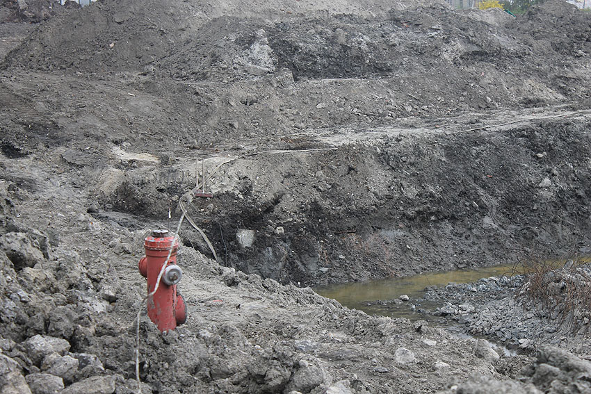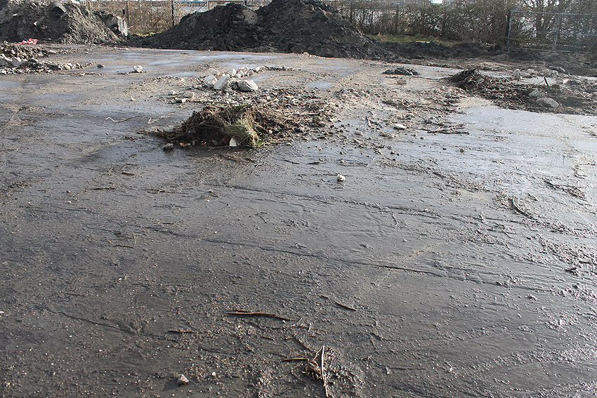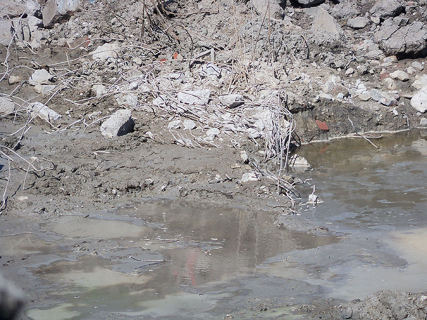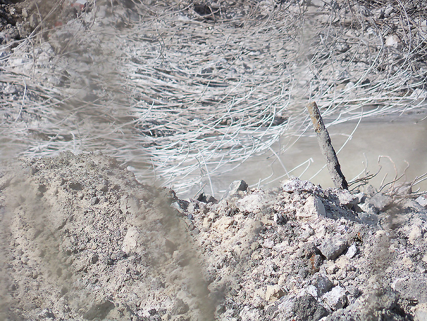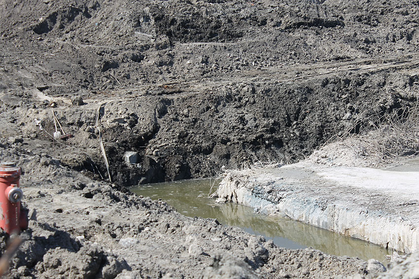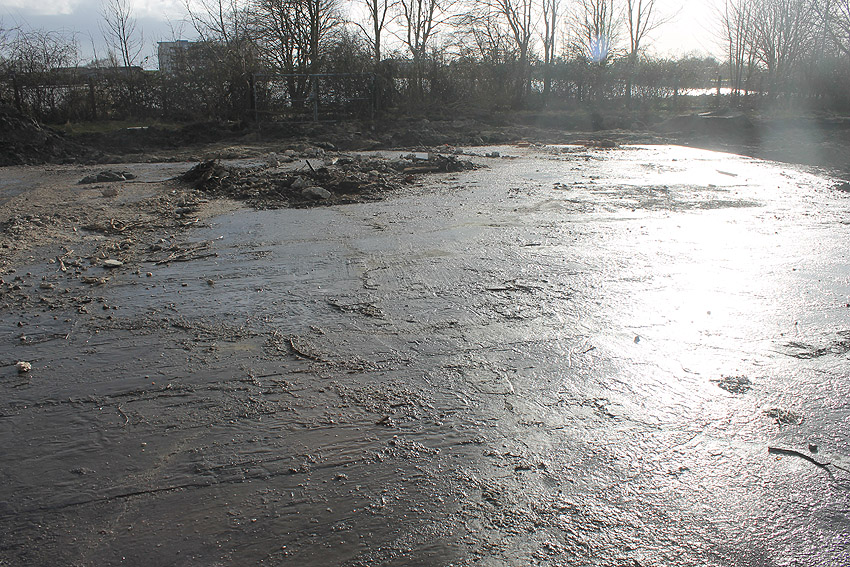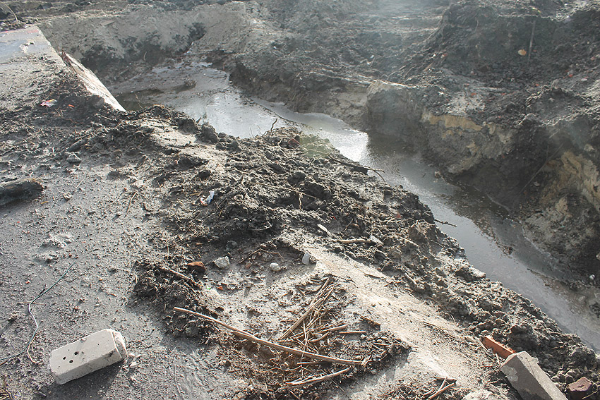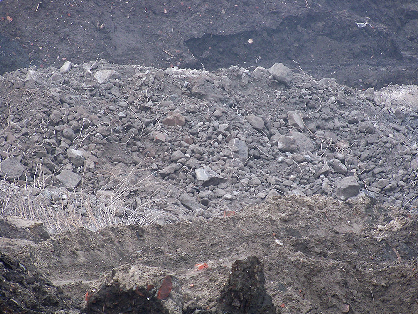 Wider Erwarten sind bis dato doch noch große Teile der Bodenplatte des Tiefbunkers erhalten geblieben. Nachdem das Grubenwasser nun abgepumpt wurde, ist die Platte freigelegt worden. Deren Abbruch ist in Arbeit.