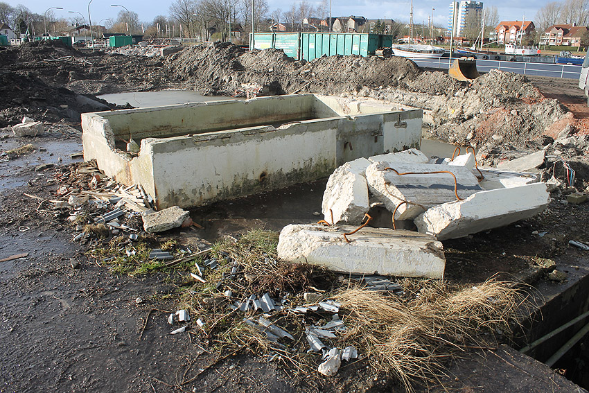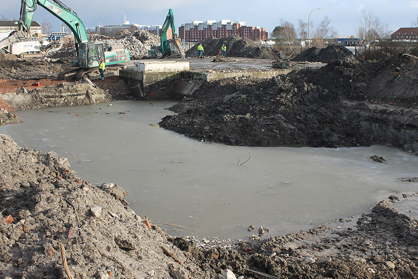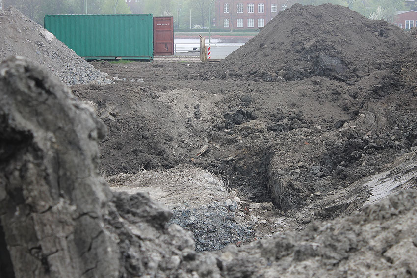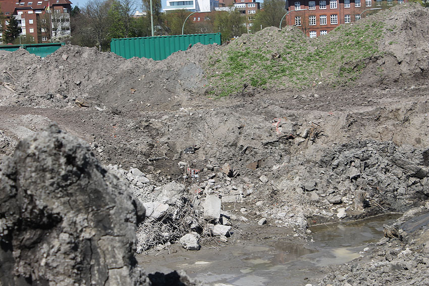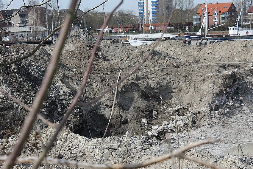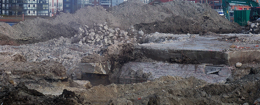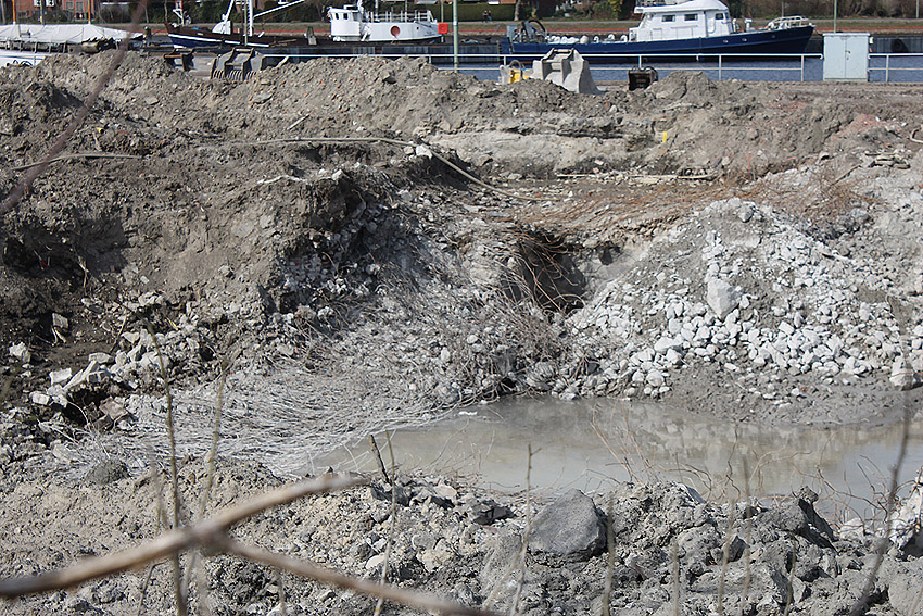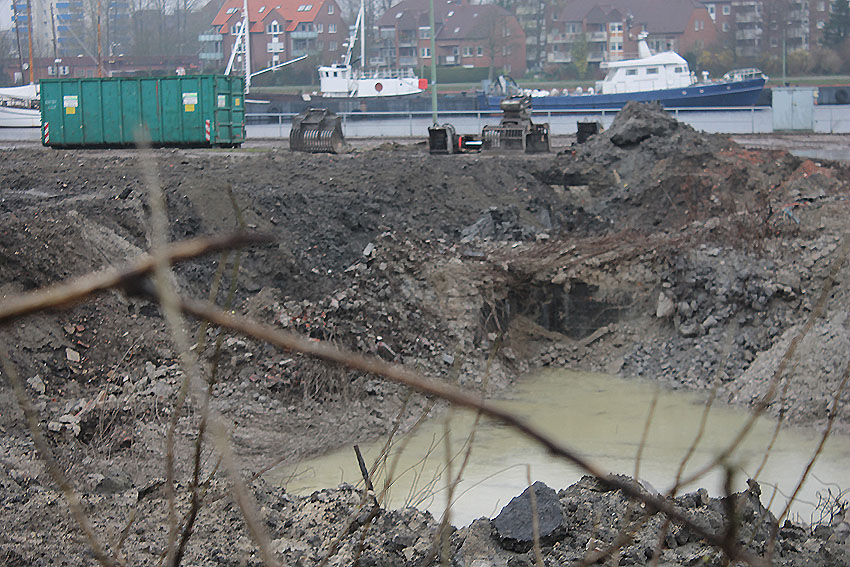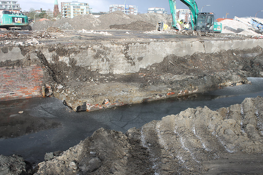 Die Bodenplatte des Tiefbunkers ist großteilig zerstört und damit nun Vergangenheit. Der Sohlbereich des Bunkers ist mittlerweile nicht unerheblich mit Grund- und Hafenwasser vollgelaufen.