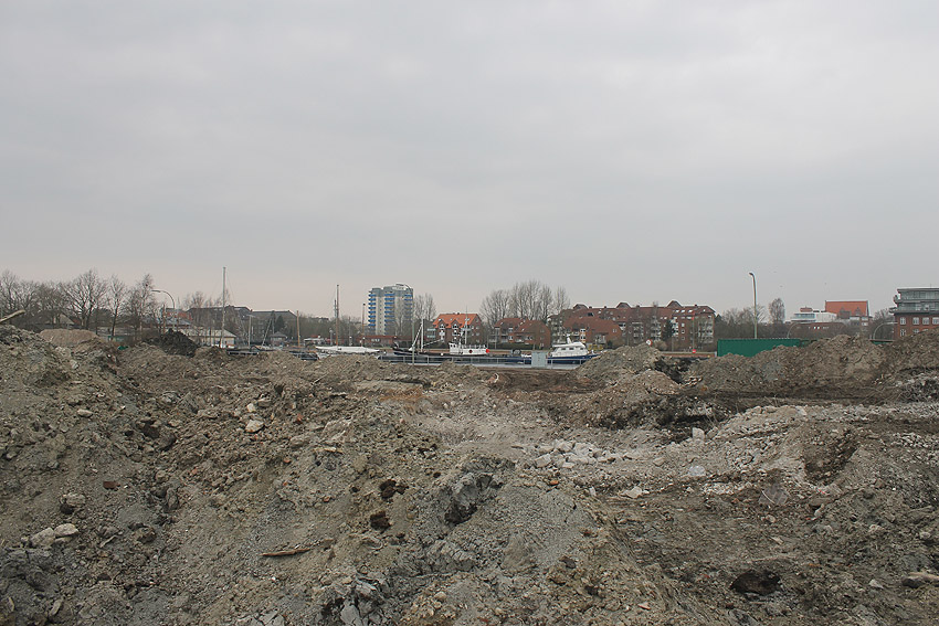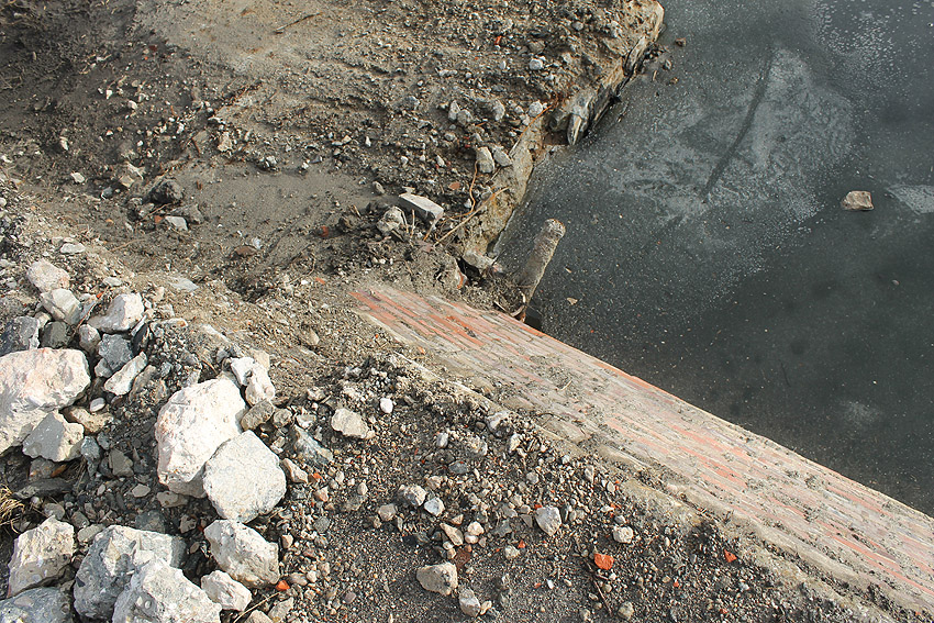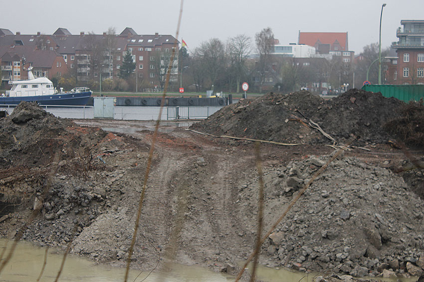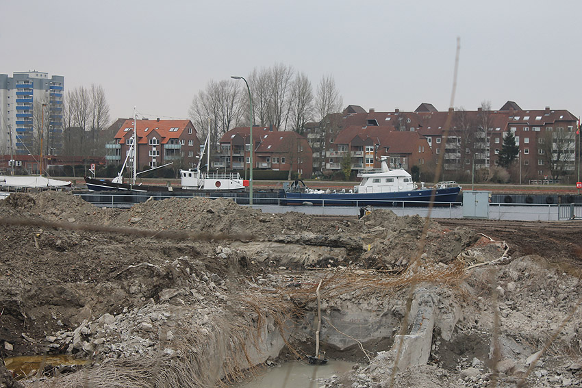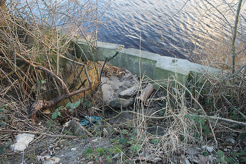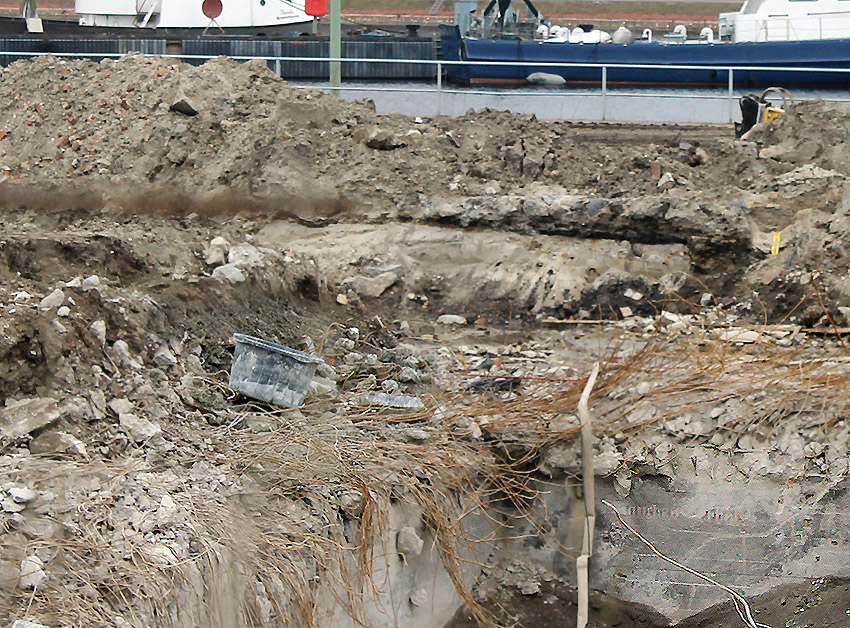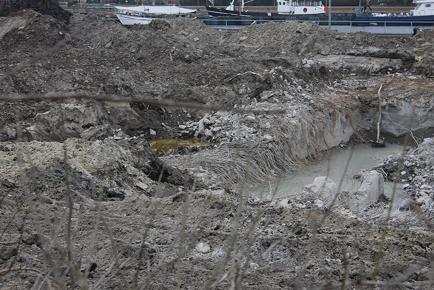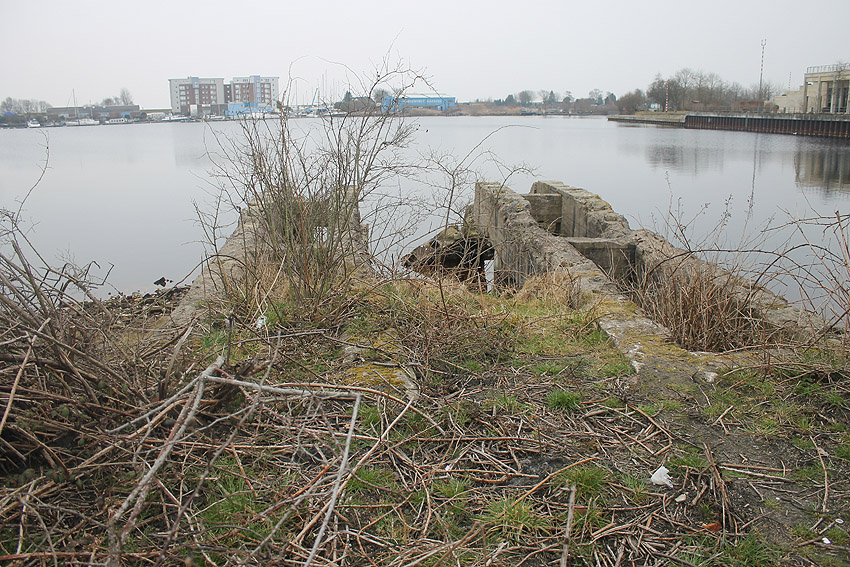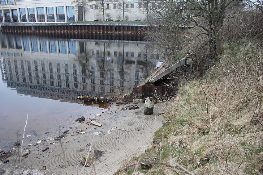 Kürzlich wurde der Wasserstand im Hafenbecken ein wenig abgesenkt. Zu sehen sind nun südlich an der Wiesbadenbrücke Trümmerrelikte, welche sonst die meiste Zeit unter der Wasseroberfläche verborgen liegen:
