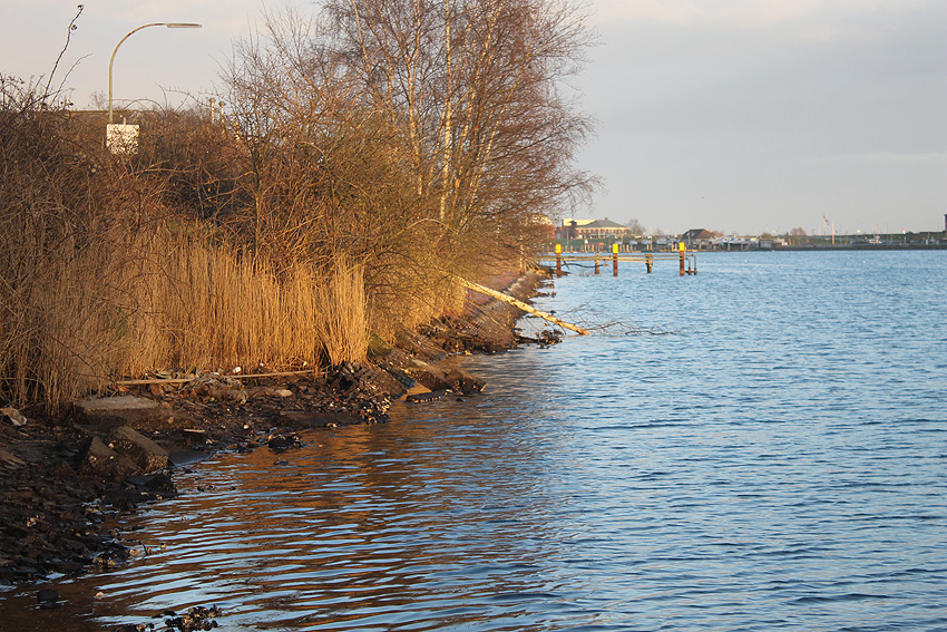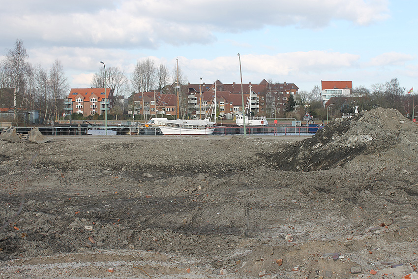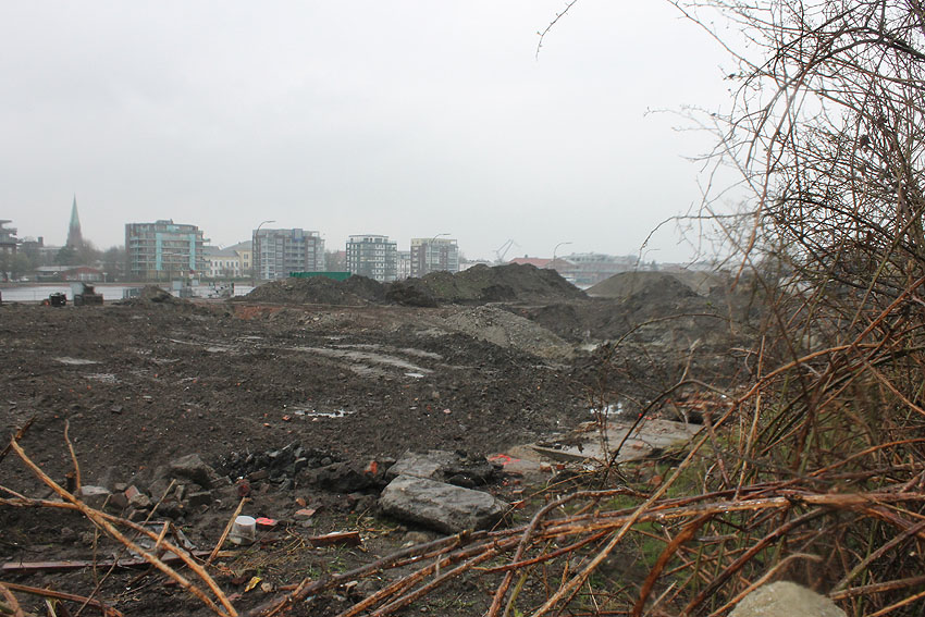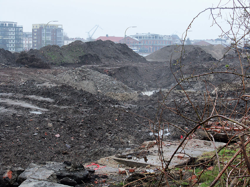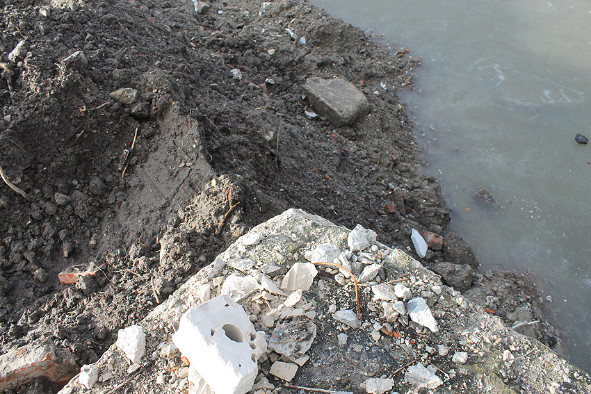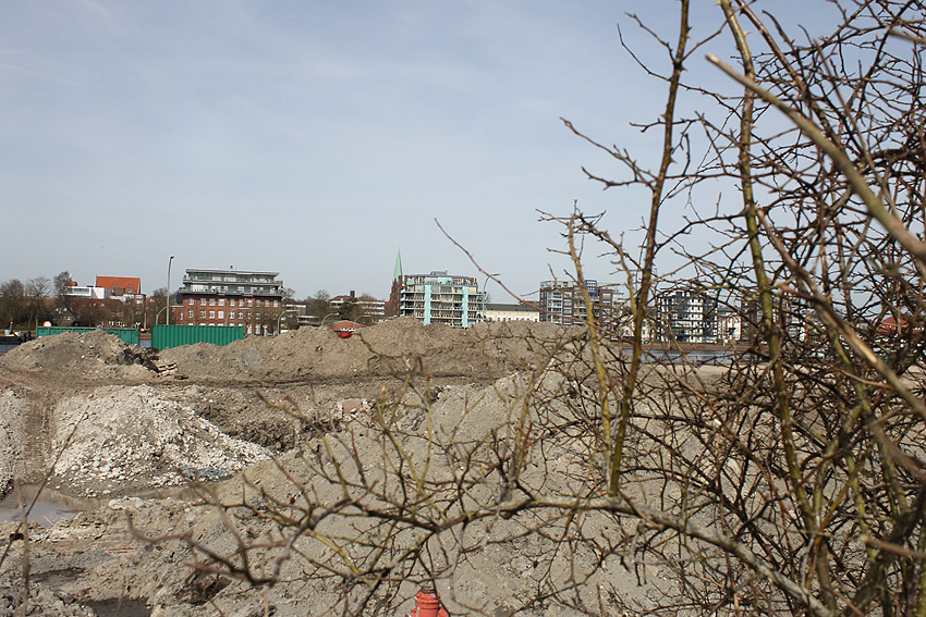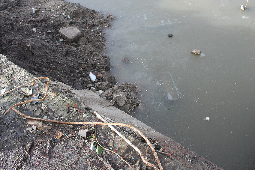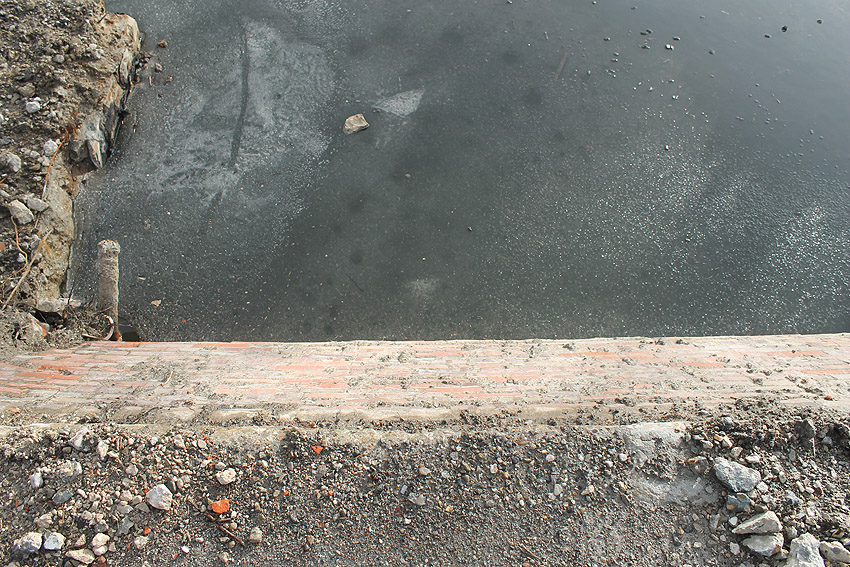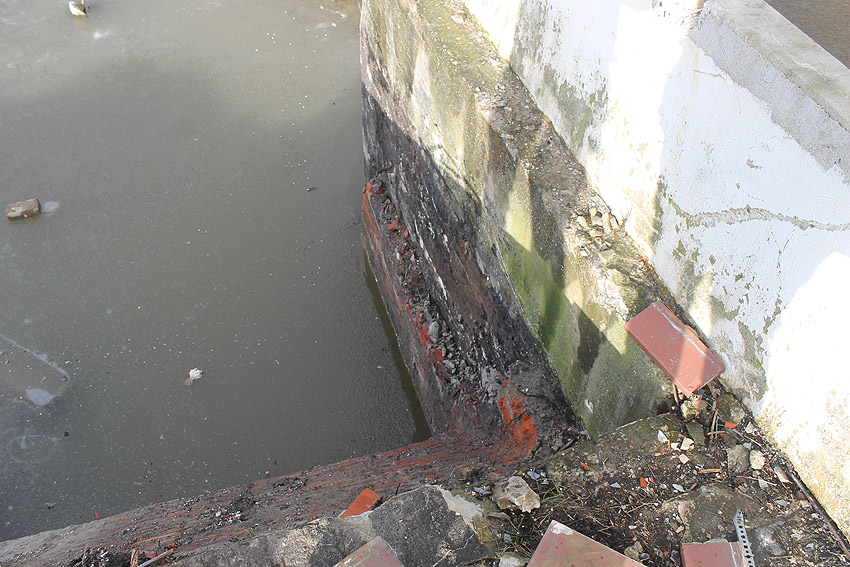 Kürzlich wurde der Wasserstand im Hafenbecken ein wenig abgesenkt. Zu sehen sind nun südlich an der Wiesbadenbrücke Trümmerrelikte, welche sonst die meiste Zeit unter der Wasseroberfläche verborgen liegen: