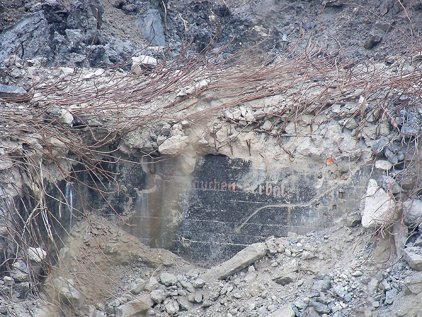 Die Sohlplatte des Tiefbunkers ist mittlerweile großteilig zerkleinert worden. Die Außenwände existieren lediglich noch in Restbereichen. Die markante Nordwestecke mit dem letzten "Rauchen verboten"-Schriftzug an der ehemaligen Innenwand blieb aber entgegen unserer Erwartung bis heute doch noch erhalten. Dennoch neigt sich der Abriss nun unaufhaltsam dem Ende entgegen. In einer Woche dürfte er abgeschlossen sein.