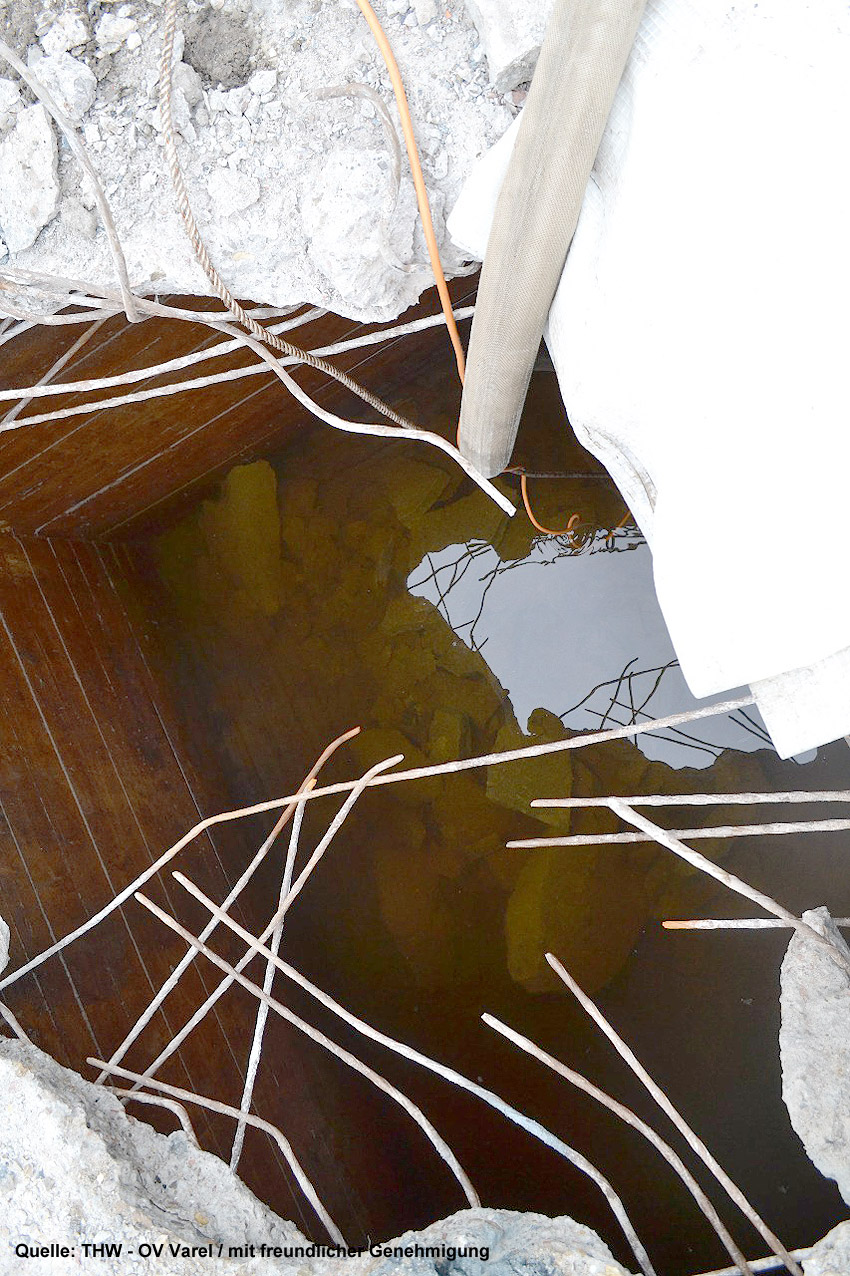 Das bereits teilweise aufgestemmte Innere am 10.02.18 beim Wasser-Abpumpvorgang: