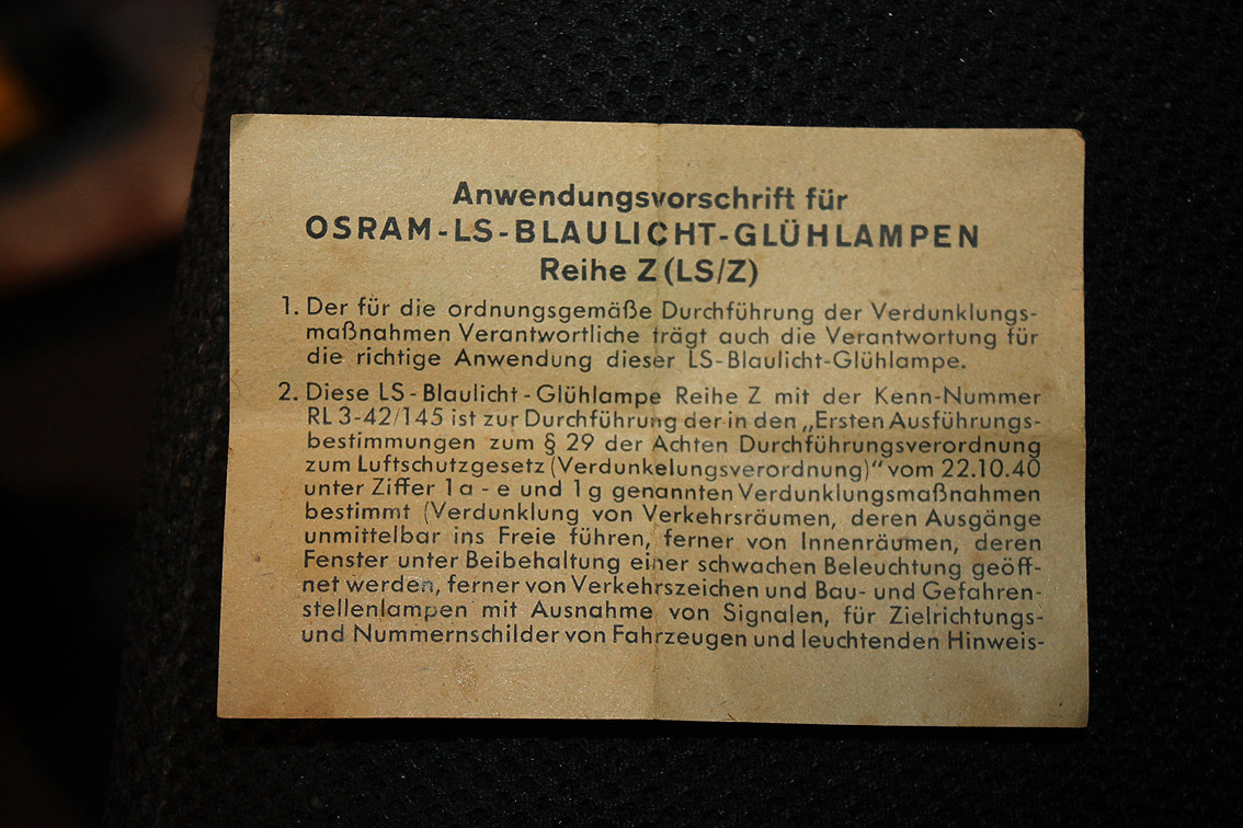 Bei Verdunklung wurden im Zweiten Weltkrieg reichsweit LS-Glühlampen benutzt, um eine Notbeleuchtung zu gewährleisten. Diejenige der Firma OSRAM war am bekanntesten und wurde mit der RL-Nummer 3-42/145 (Blaulicht) eingetragen. Dies hieß, dass das Produkt für Luftschutzzwecke offiziell genehmigt worden war.